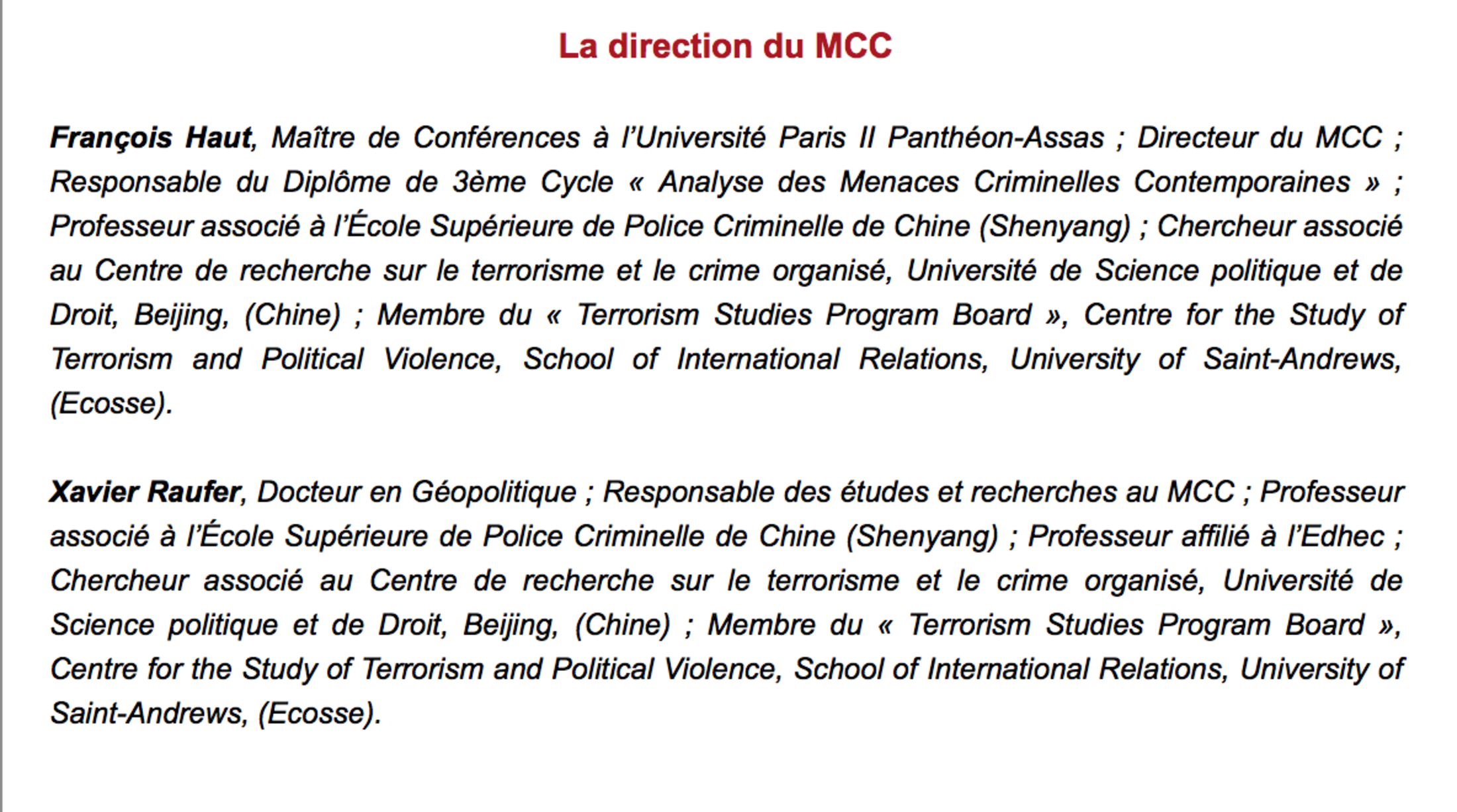 François Haut, Maître de Conférence à la dite Université est responsable du diplome de 3ème cycle « Analyse des Menaces Criminelles Contemporaines » et Directeur de ce curieux Département MCC, dont il sera dit qu'il n'est en fait qu'une association hébergée dans les locaux de l'Université....
