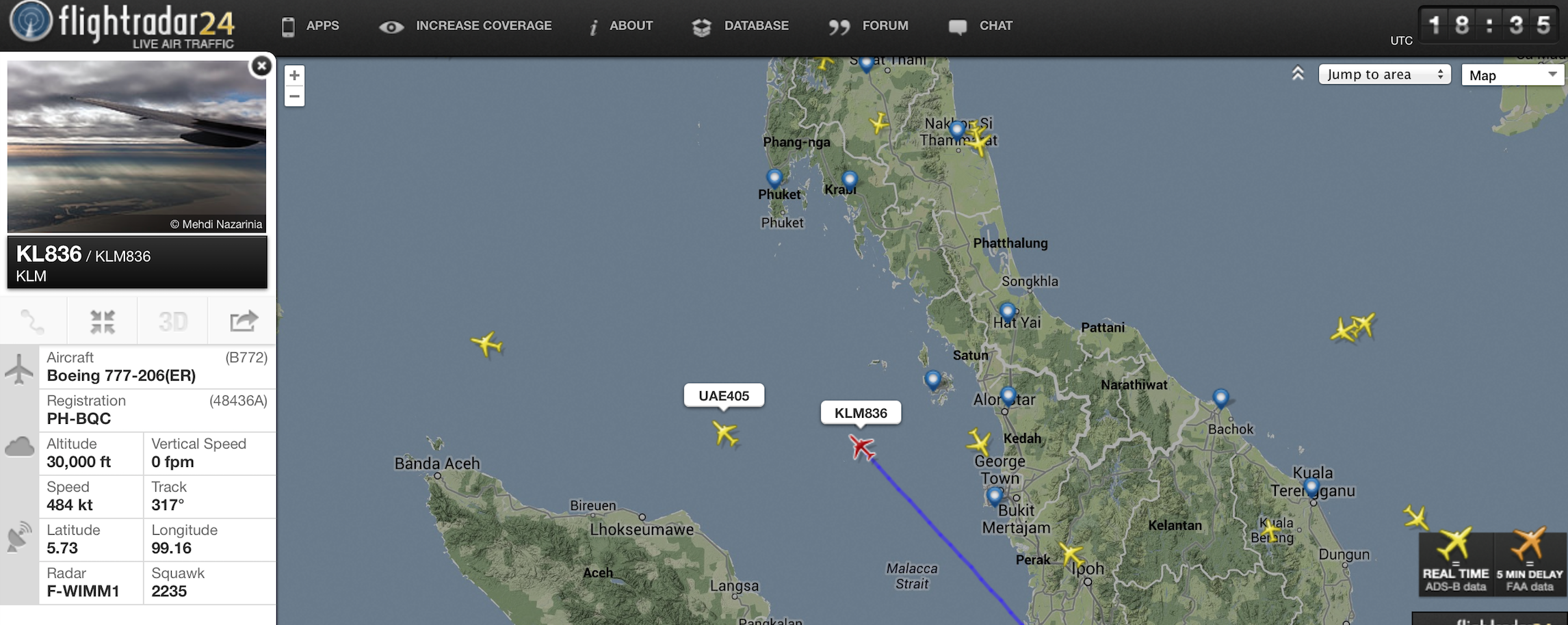 Pour le KLM 836, c'est le journal de vol de flightaware qui montre le mieux le passage sur Pulau Perak ( coordonnées les plus proches ) à
