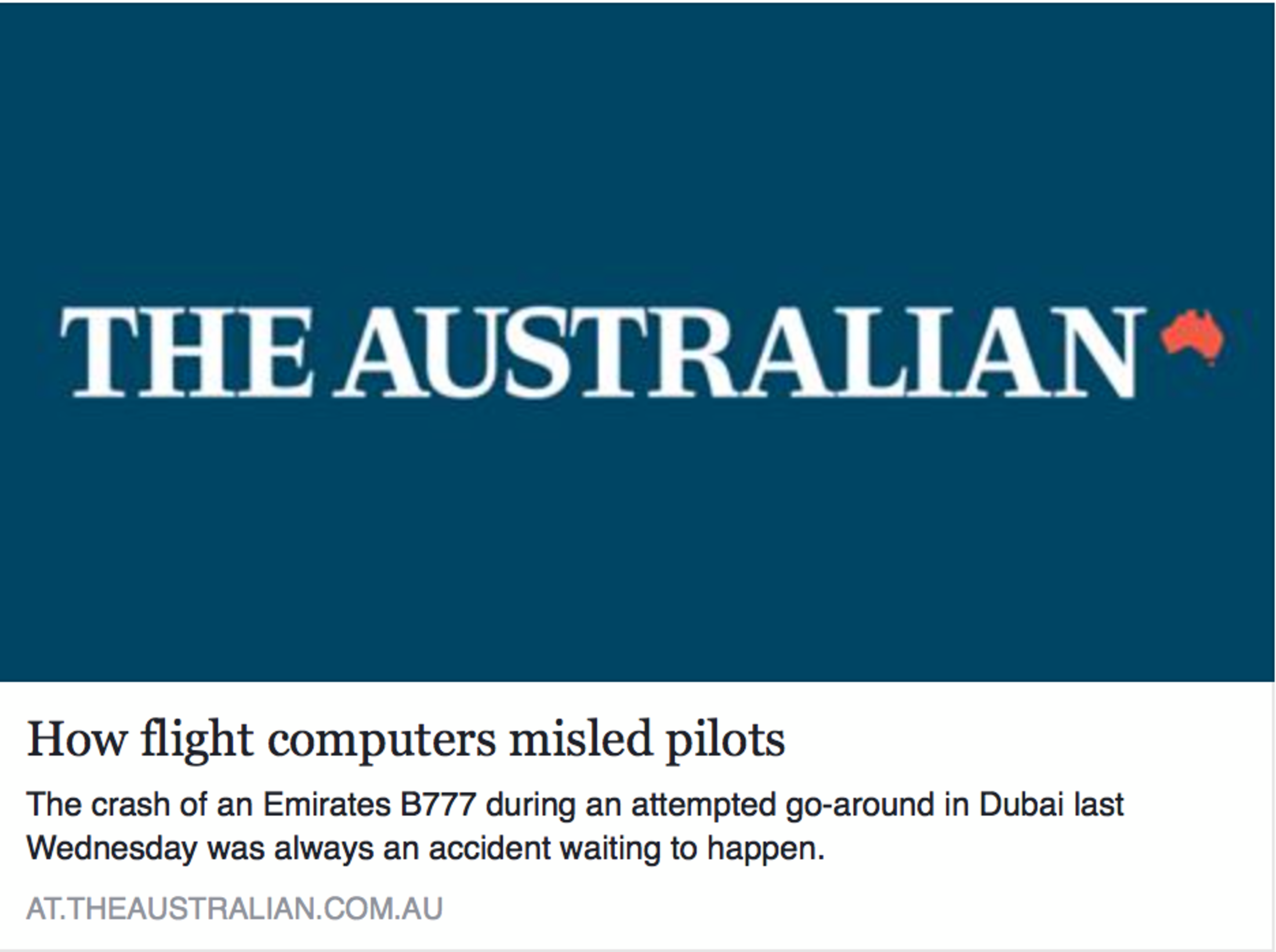 NON ! Les automatismes ne laissent pas tomber les pilotes, comme le suggère malgré tout BYRON BAILEY dans son article publié dernièrement dans le journal The Australian. Captain Byron Bailey devrais-je dire en citant l'éminent Senior Captain qui a porté les couleurs d'EMIRATES pendant 15 ans. Il explique qu'il n'est pas si rare de subir des rebonds importants à l'atterrissage qui sont alors délicats à gérer, toujours, s'agissant de la poursuite de l'atterrissage. Il est plus rare en revanche, de remettre les gaz durant ce rebond, ce qui s'est passé à Dubaï pour EK 521.