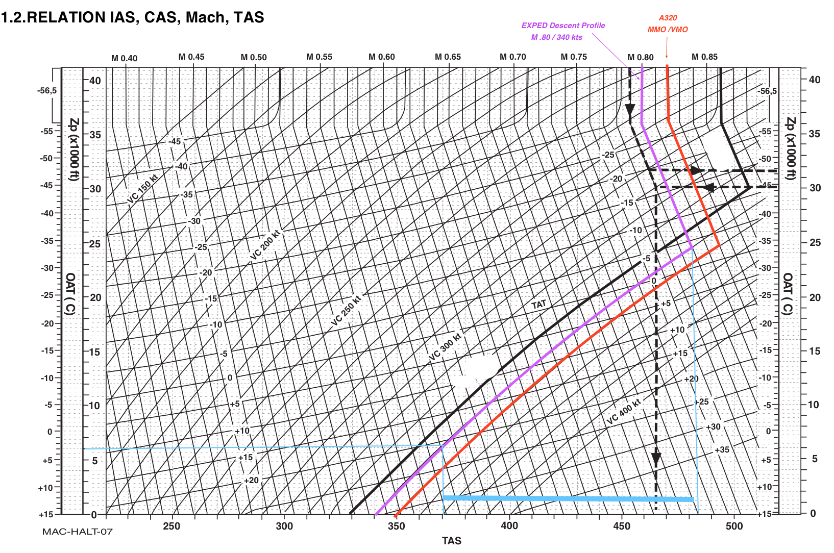 Les relations entre IAS, CAS, Mach, TAS sont données par l'universel Abaque de Chevalier . Cet abaque permet d'imaginer que l'avion a pu suivre pour la descente des instructions très précises en termes de vitesses soit M .82, et IAS 350 kts.