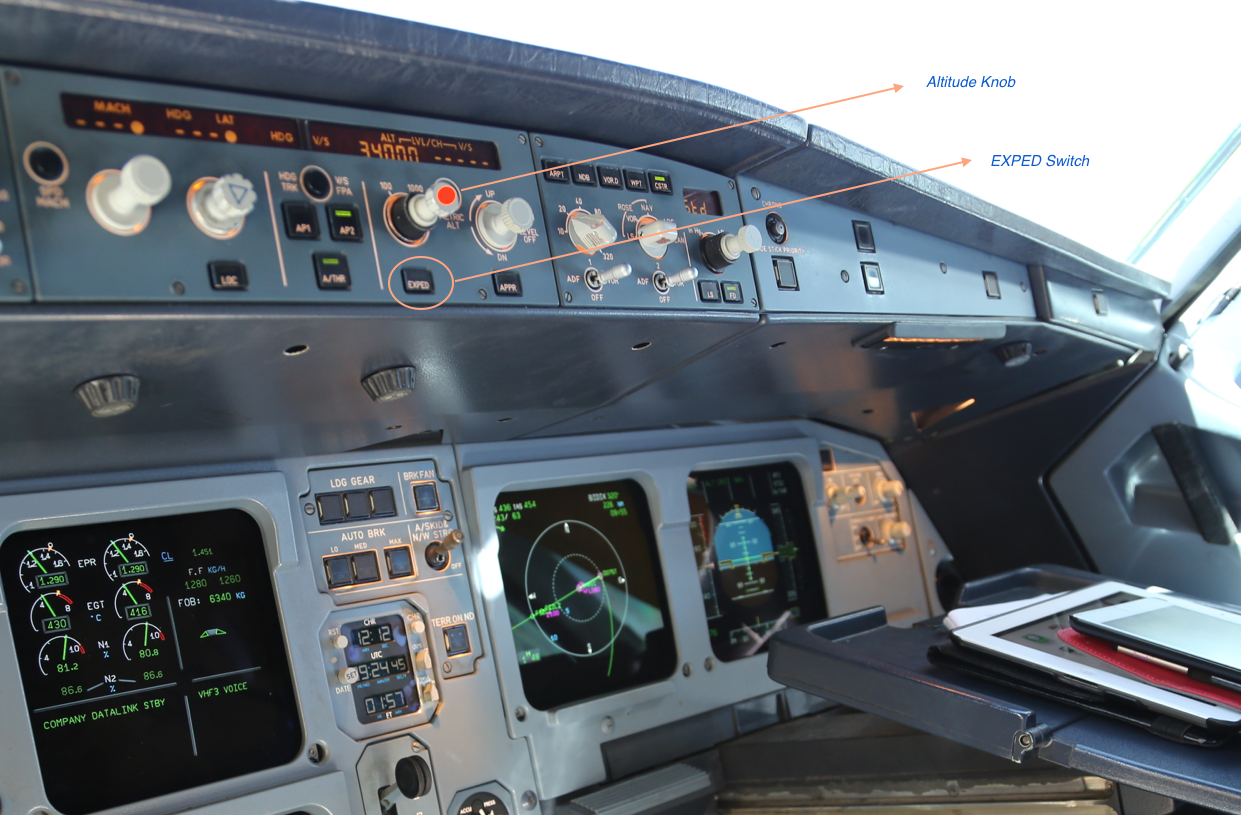 Pour obtenir un profil de descente proche de ce qui vient d'être écrit plus haut, il suffisait de sélectionner une altitude inférieure à 38 000 ' et appuyer sur la touche EXPED ( expedite descent ) en l'occurence.
