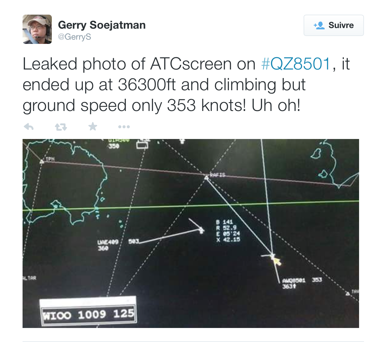 Un fait troublant permet pourtant d'avancer quelques développements : Une photo a fuité sur tweeter, celle de l'écran de contrôle du centre ATC qui suivait le vol. On y constate que le vol QZ8501 passait le niveau de vol 363, en montée à une vitesse de 353 kts.