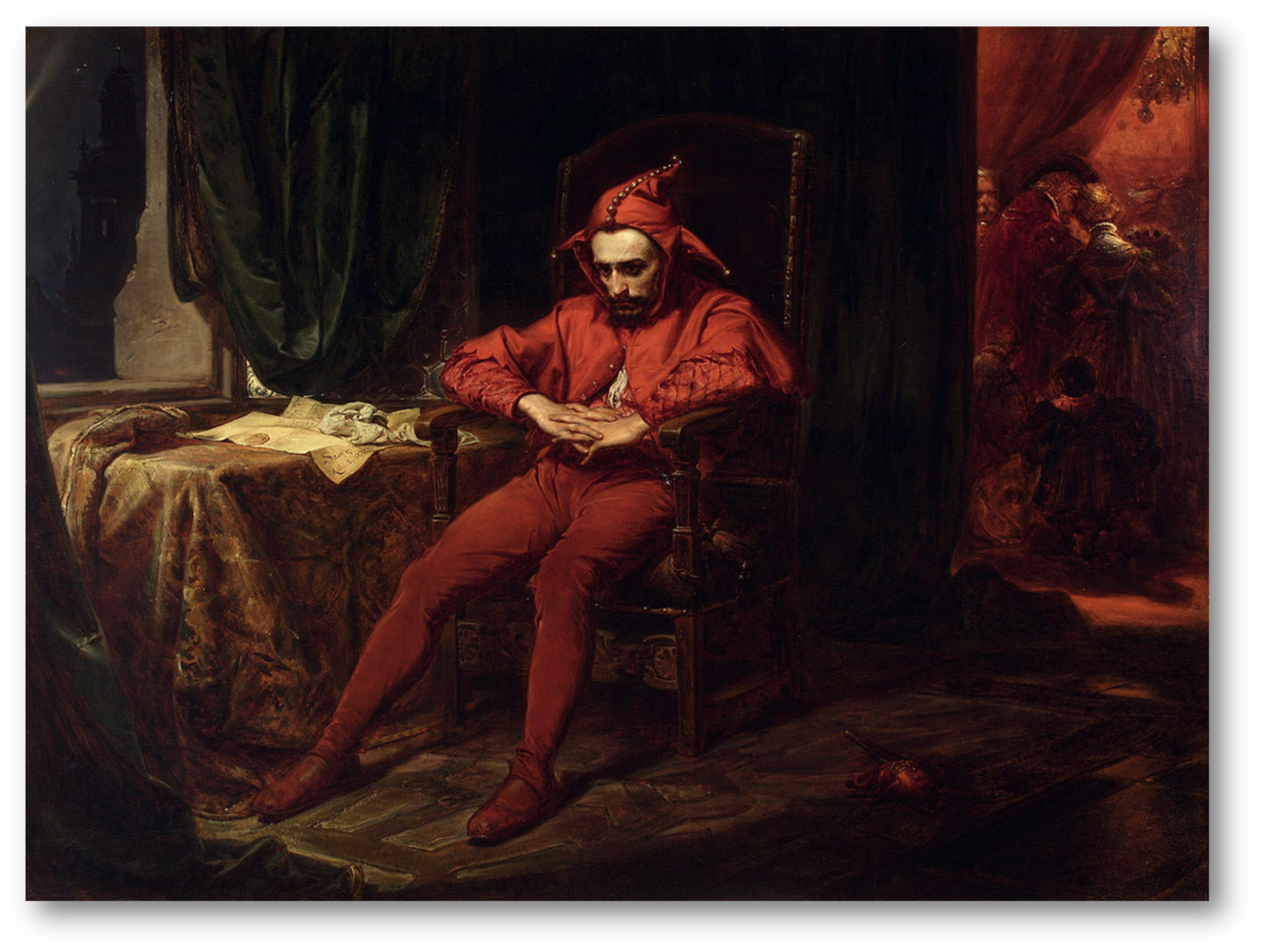 Au cœur de la rouge composition, l’amuseur, dépité, abandonnant les exigences du protocole et ses propres atours, délaissant cette confrérie qui ne voit en lui qu’un pantin, trônant, seul comme la tour à la lanterne sous le ciel étoilé…