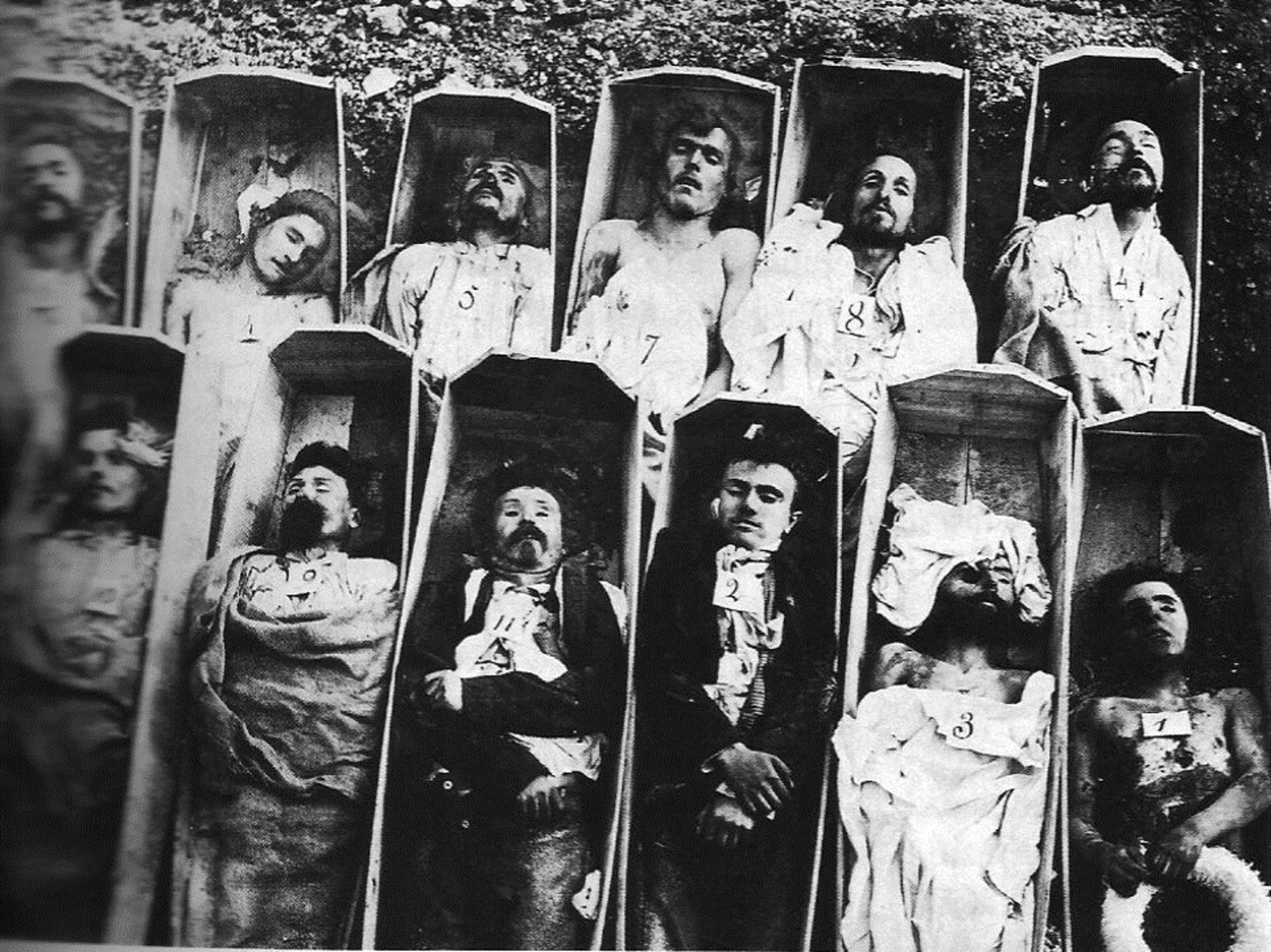 Lorsque la République émerge au lendemain de la défaite contre la Prusse et ses alliés, puis de l’impossible restauration des Bourbons, elle ne peut ignorer l’infâme répression infligée à la Commune de Paris. Une photographie ici, dira tout. Elle est sans doute offense à l’image des malheureux engoncés dans leurs cercueils de fortune (il en existe une autre où la volonté d’humilier est encore plus crue), mais elle rappelle surtout, et c’est fondamental, la volonté d’anéantissement d’une humanité en quête de Fraternité, soit la plus noble des solidarités. Non pas la solidarité bourgeoise qui sert de paravent à la prédation, mais la solidarité de tous, pour tous. C’est donc André Adolphe Eugène Disderi, pionnier dans la photographie de rue, qui nous lègue ce terrible et émouvant témoignage de 1871 :