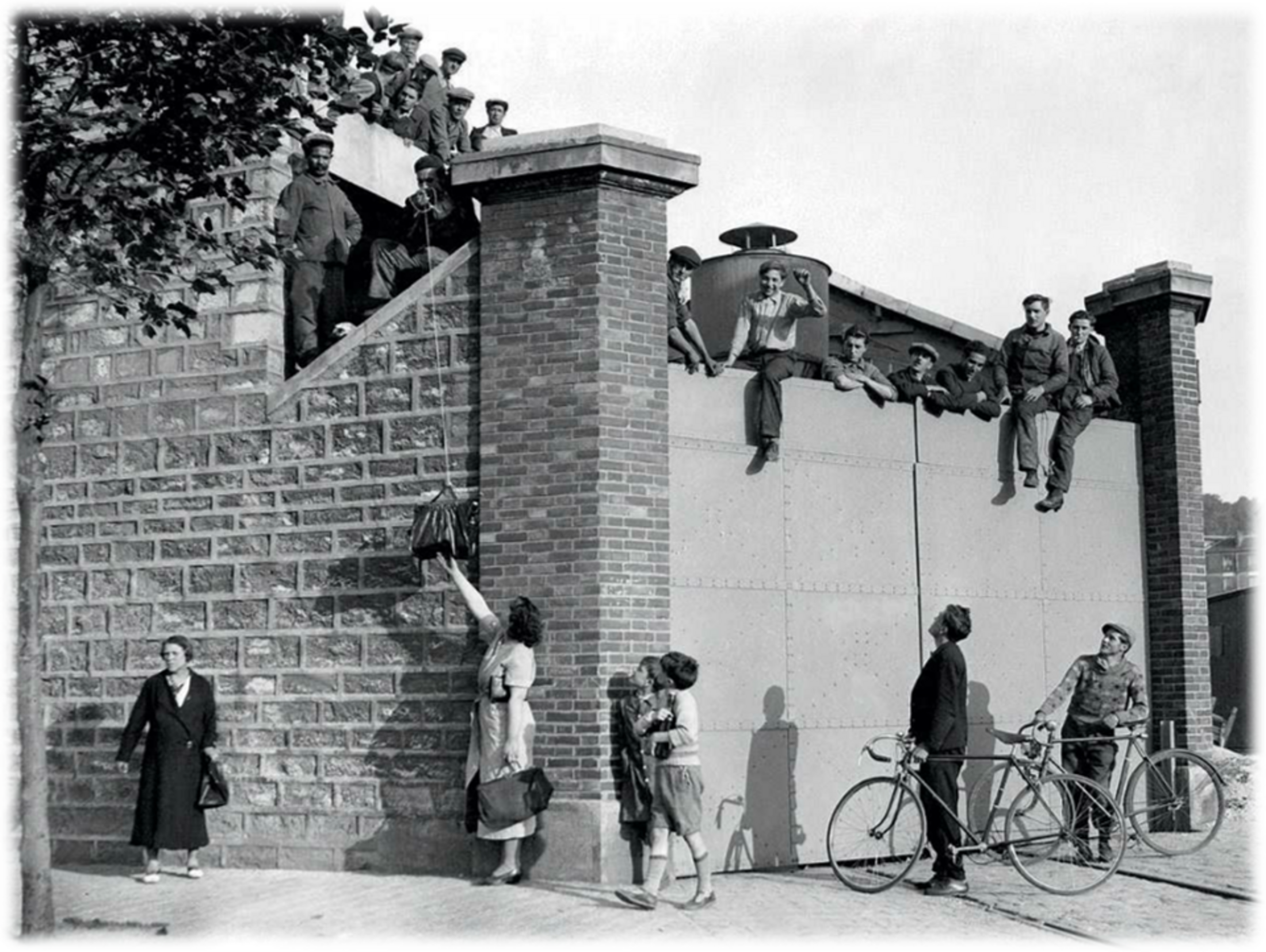 Une rupture, donc ? Oui, car les portes d’acier riveté sont closes en neutralisant une voie ferrée, soit la révolution industrielle domptée par une société qui veut s’affranchir. Derrière ces murailles probablement édifiées pour en supplanter d’autres, abattues en 1789, les salariés se retranchent et les verres enfin s’entrechoquent avant de regagner des lèvres bavardes, au son de l’accordéon ou des propos enflammés de tel syndicaliste. Car les hommes attendent, bérets ou cheveux aux vents de mai, les yeux tournés vers les ors de la République. Ailleurs, les ouvrières ne sont pas en reste...