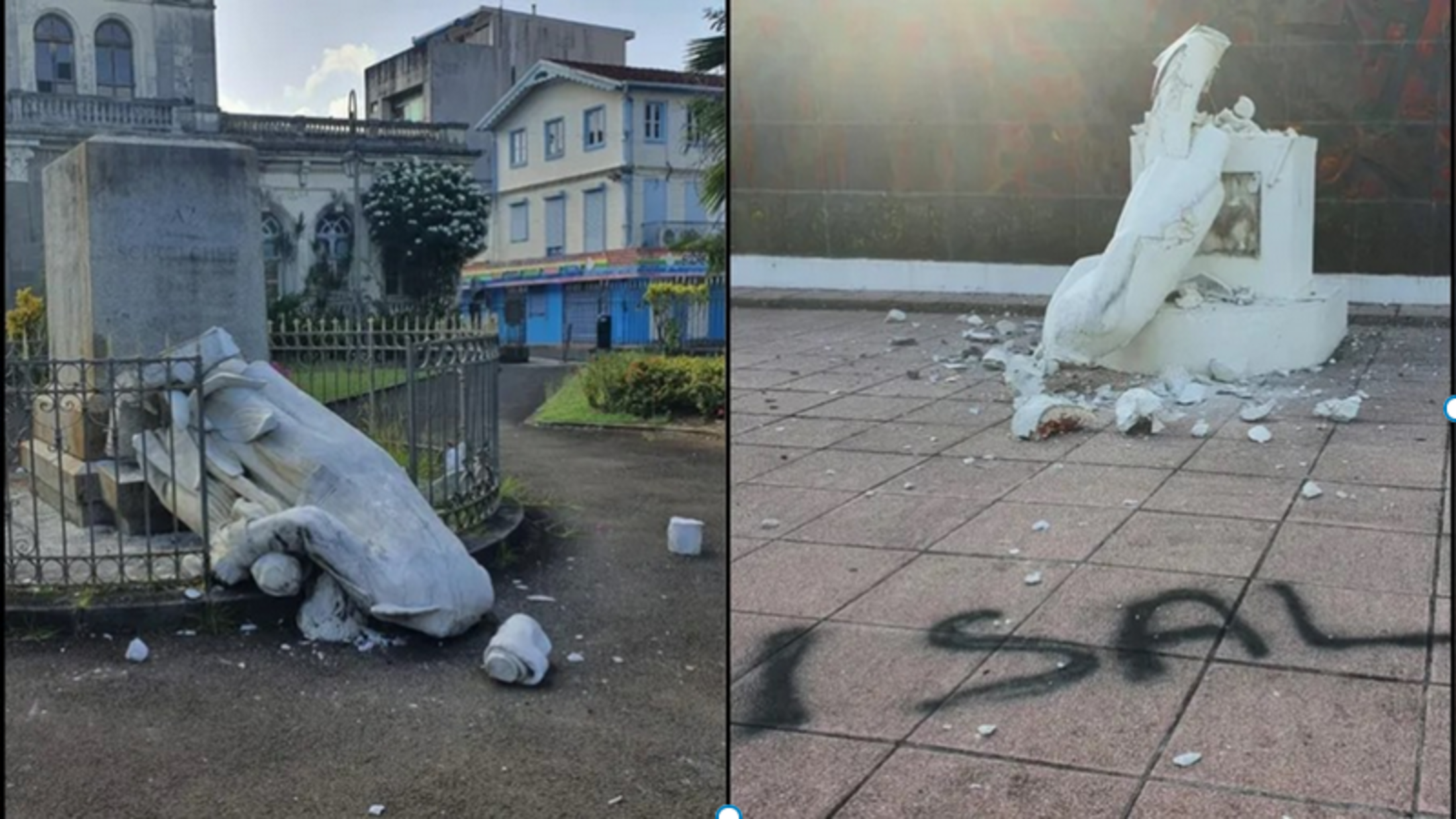 Les statues de Victor Schoelcher situées à Schoelcher et à Fort-de-France détruites le 22 mai 2020, jour de la commémoration en Martinique de l’abolition de l’esclavage. ©Claude Gratien[1]