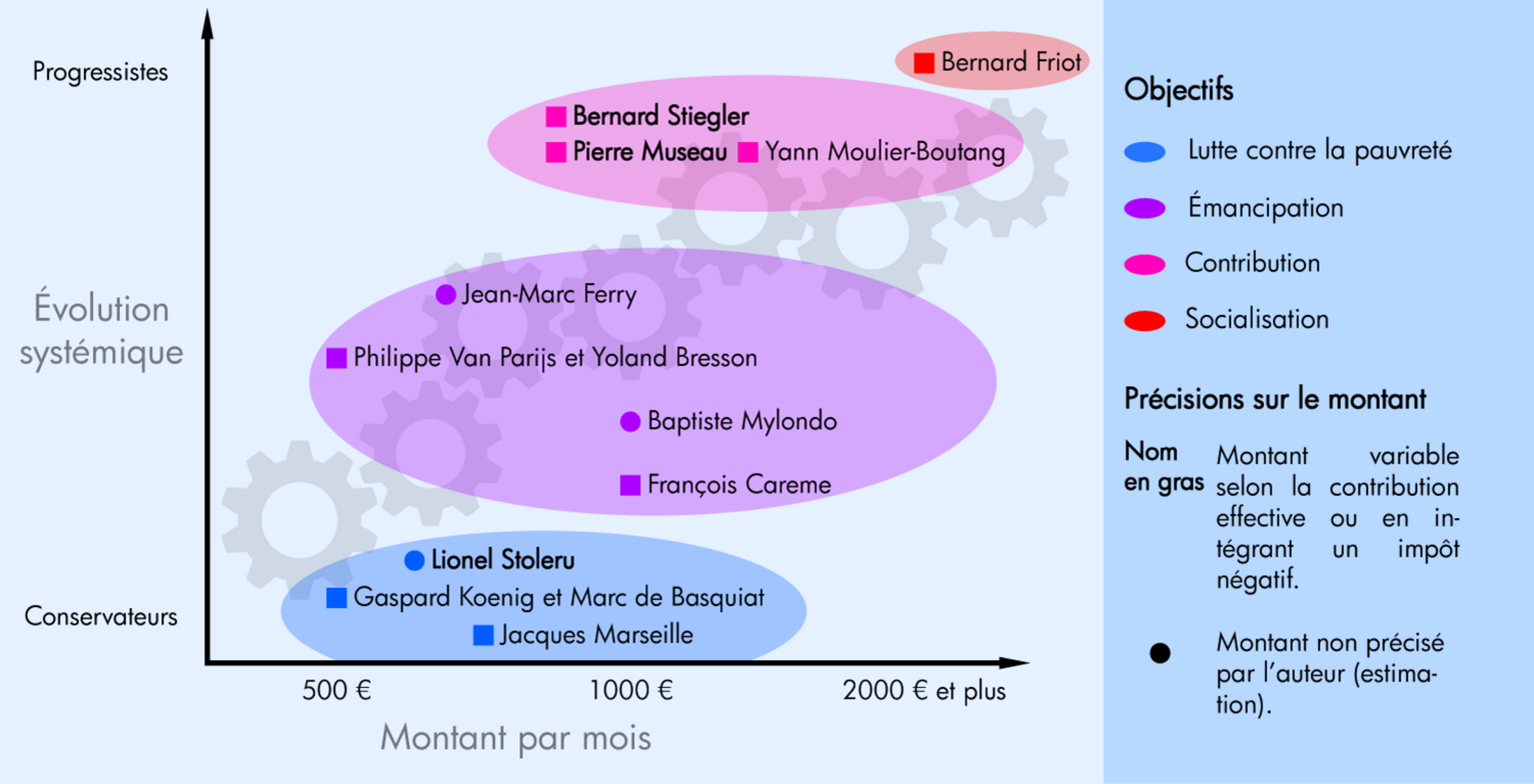 Yann Moulier-Boutang se singularise, quant à lui, par le mode de financement de son RU, qui consiste à appliquer une taxe sur les flux de capitaux. D’un montant de 2%, cette taxe pourrait financer un revenu de base de 1200€ pour l’ensemble des Français, sans toucher aux autres équilibres. Yoland Bresson propose de son côté que la création monétaire bénéficie directement aux individus. Enfin, Bernard Friot, avec son salaire à vie, se distingue par son ambition d’élargir le modèle de la Sécurité sociale aux salaires, via des cotisations alimentant des caisses de répartition. La plupart de ces modèles fixent un niveau de revenu universel au niveau du Smic actuel et au-delà, permettant d’assurer à l’ensemble de la population un revenu d’existence suffisant pour permettre leur émancipation par rapport au travail contraint.