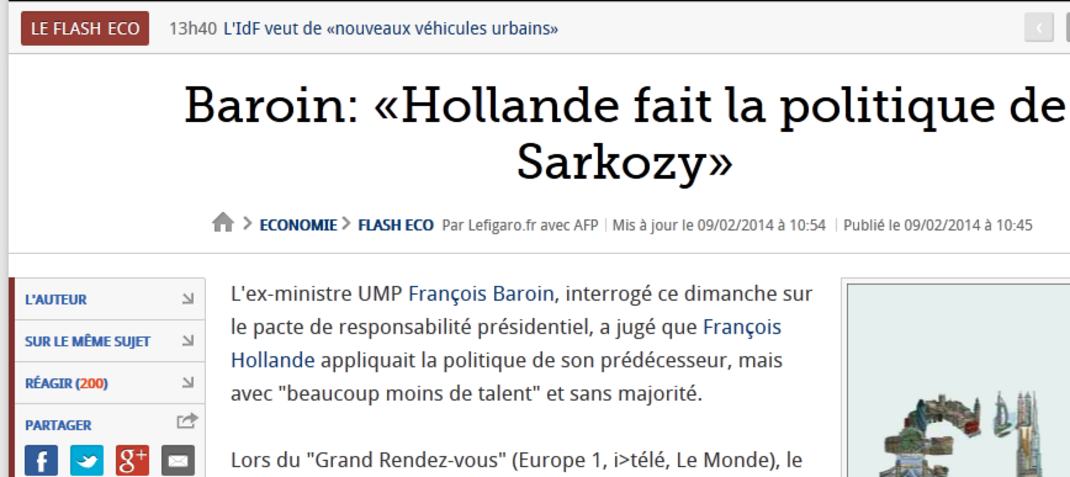 Le titre tardive du torchon de Dassault: Baroin: «Hollande fait la politique de Sarkozy»