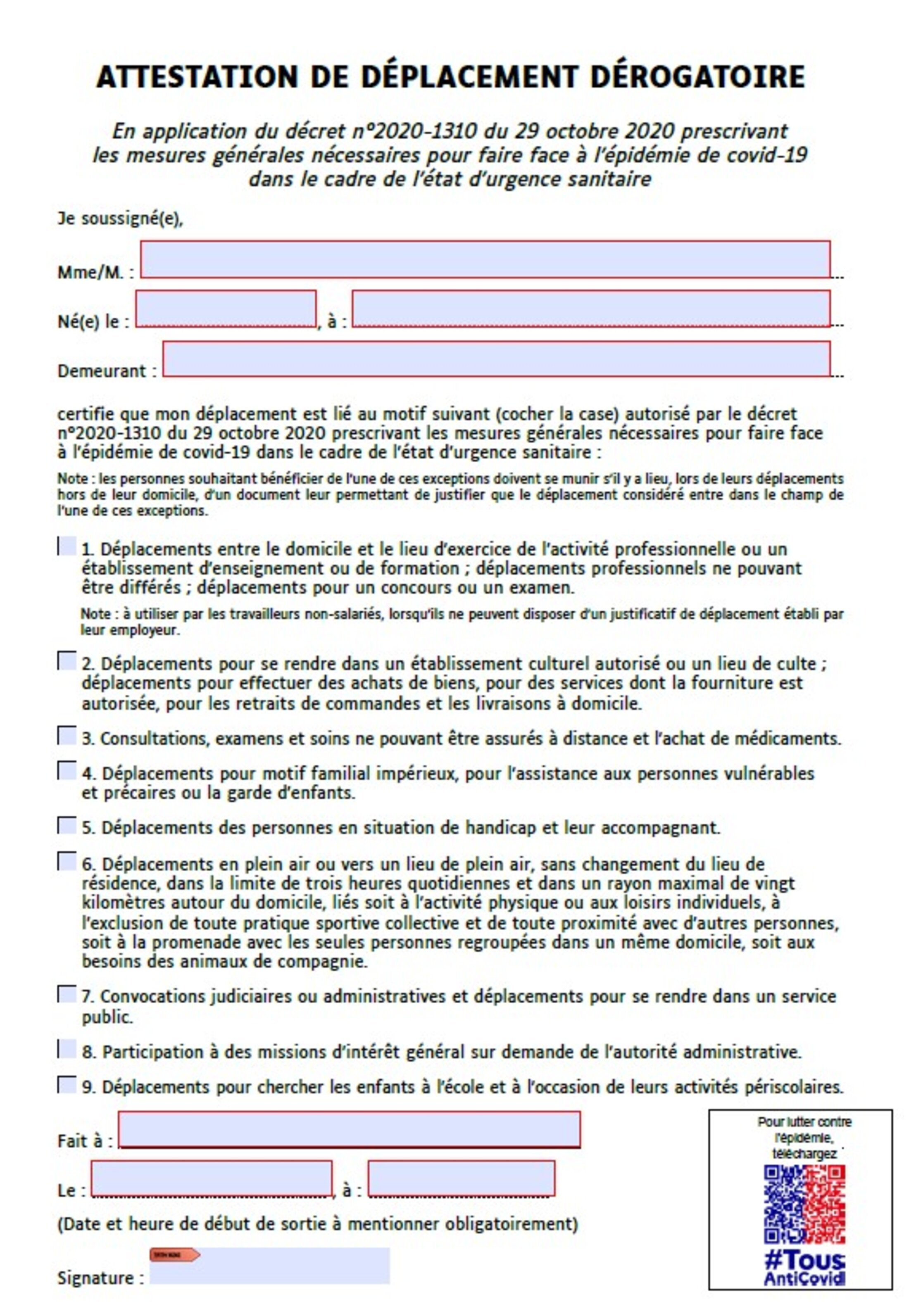 I. - Tout déplacement de personne hors de son lieu de résidence est interdit à l'exception des déplacements pour les motifs suivants en évitant tout regroupement de personnes :