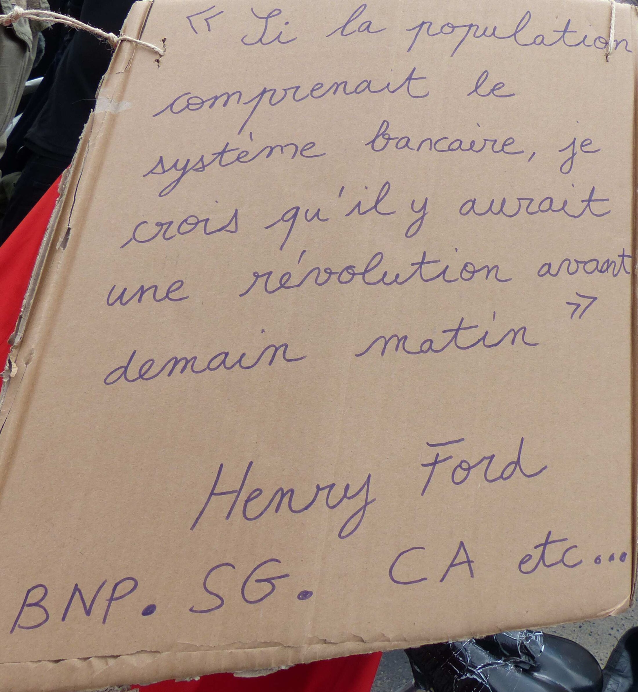 Une manifestante qui rentre chez elle les double. Sur sa pancarte dans le dos est écrit : "Si la population comprenait le système bancaire, je crois qu'il y aurait une révolution avant demain matin" Henry Ford BNP . SG . CA etc...