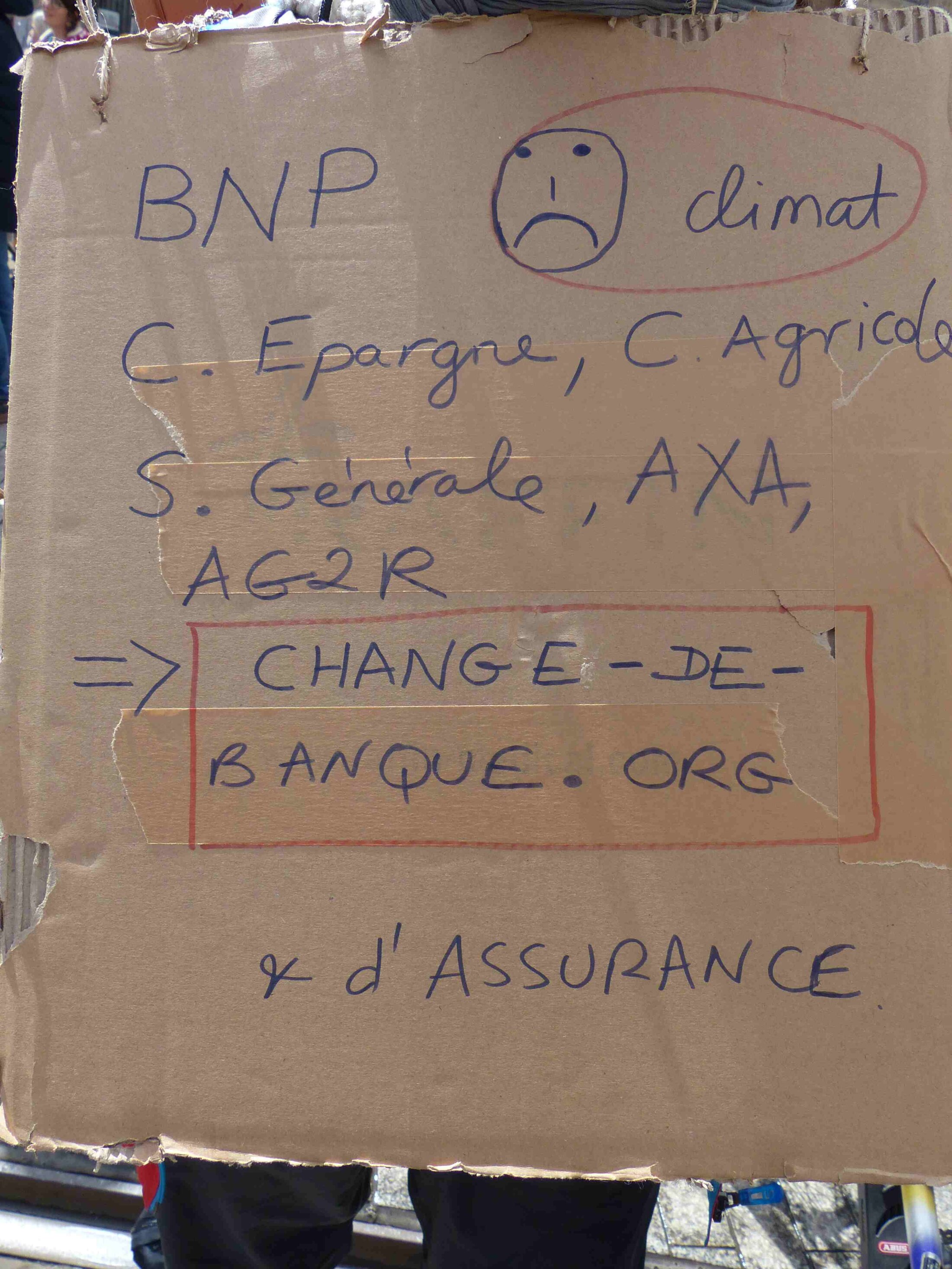 Une manifestante s'apprête à entrer dans une boulangerie quand Lanche lui demande s'il peut photographier sa pancarte. Est écrit : BNP, C. Epargne, C. Agricole, S. Générale, Axa, AG2R; une flèche indique change-de-banque.org & d'assurance. Le mot climat et un émoticône exprimant la tristesse sont entourés d'un cercle rouge.