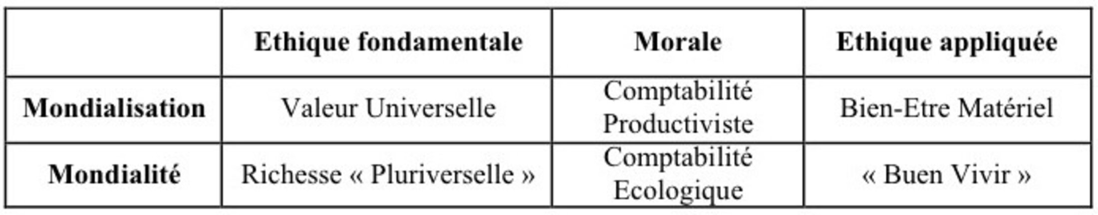 C’est en ce sens qu’à l’éthique productiviste de la mondialisation, il faut opposer une éthique écologiste qui réfère au concept de mondialité, cher à Edouard Glissant. C’est à dire non pas l’intégration unifiée d’un impérialisme marchand, mais une écologie de la diversité comme richesse « pluriverselle ». On peut synthétiser dans le tableau suivant l’opposition entre les normes comptables productivistes (en tant qu’elles instrumentent la morale de l’institution ordolibérale), et les normes comptables écologistes qu’il revient aux mouvements émergents de faire advenir comme les pratiques porteuses de nouvelles formes de prospérité.