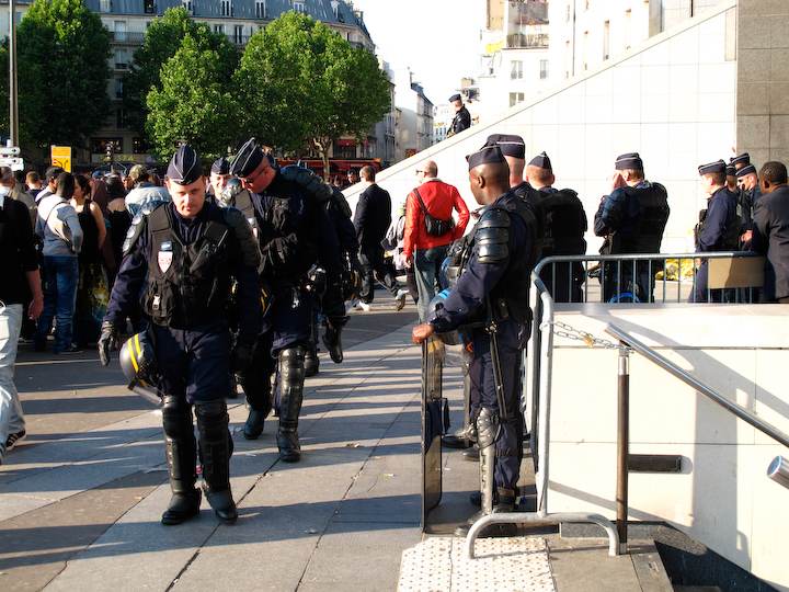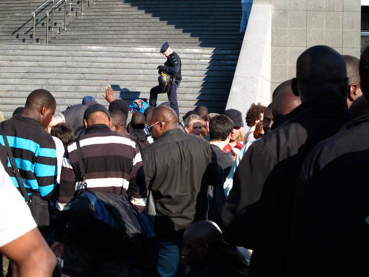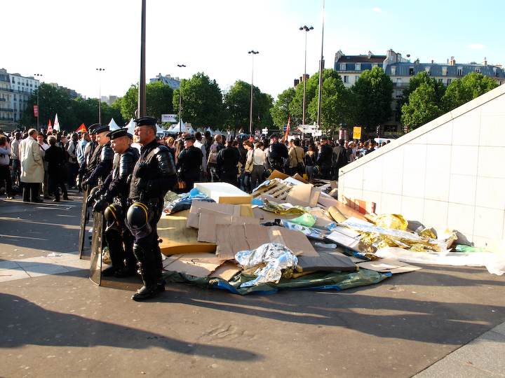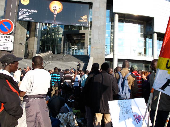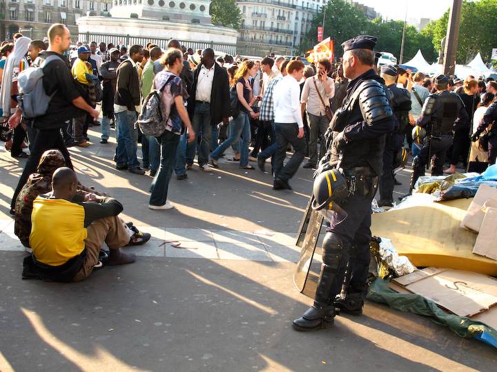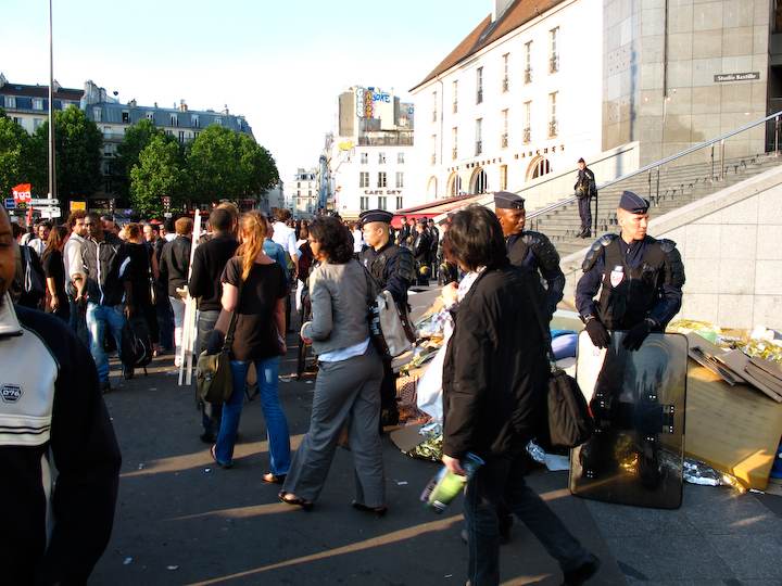 Ce jeudi soir vers 19h30, onze heures après avoir été évacués des marches de l'Opéra Bastille, les travailleurs sans-papiers, rejoints par quelques personnes en soutien, ont repris leur position sur la place. Mais face au CRS, cette fois. Entre les deux circulent les passants. Aperçu.