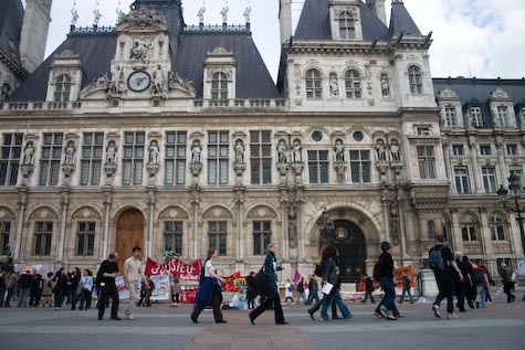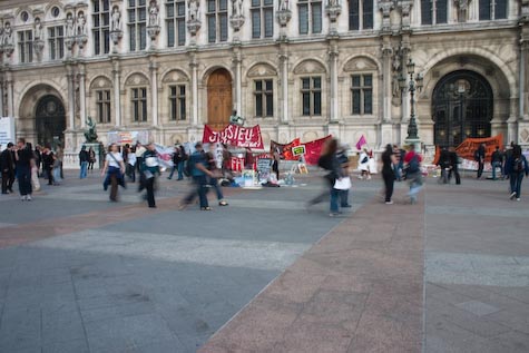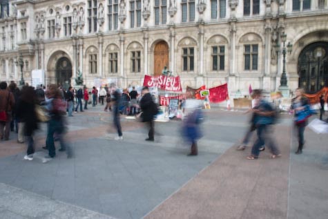 Ce qui frappe, c’est le calme avec lequel les « protestataires » déambulent sur l’ancienne place de grève, alors que sur les côtés filent les voitures et les bus. Le mouvement des marcheurs se noie par instants dans la foule qui traverse le parvis, sans cesser son pas lent. Il y a un aspect paisible, simple, presque hypnotique, comme un cercle de prière tibétain.