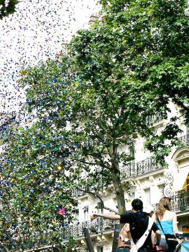 Une ambiance festive et techno, particulièrement jeune et ouverte, sous une pluie de confetti, de tracts, de mousse parfois, et de préservatifs.