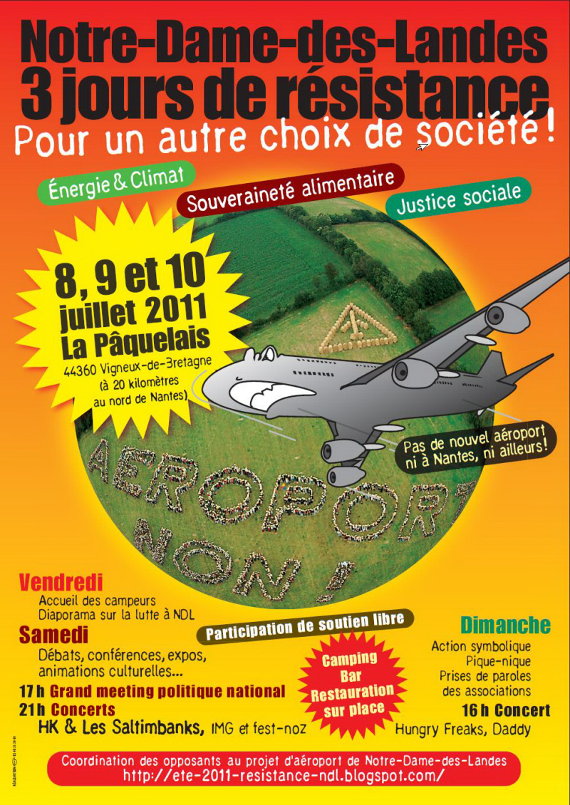 Le rassemblement national des 8, 9 et 10 juillet 2011 sur les terres de Notre-Dame-des-Landes permettra de mettre l'accent sur les alternatives qui permettront à nos sociétés de garantir un environnement vivable pour les générations futures, et sera un moment fort vers l'abandon du projet aberrant de nouvel aéroport.