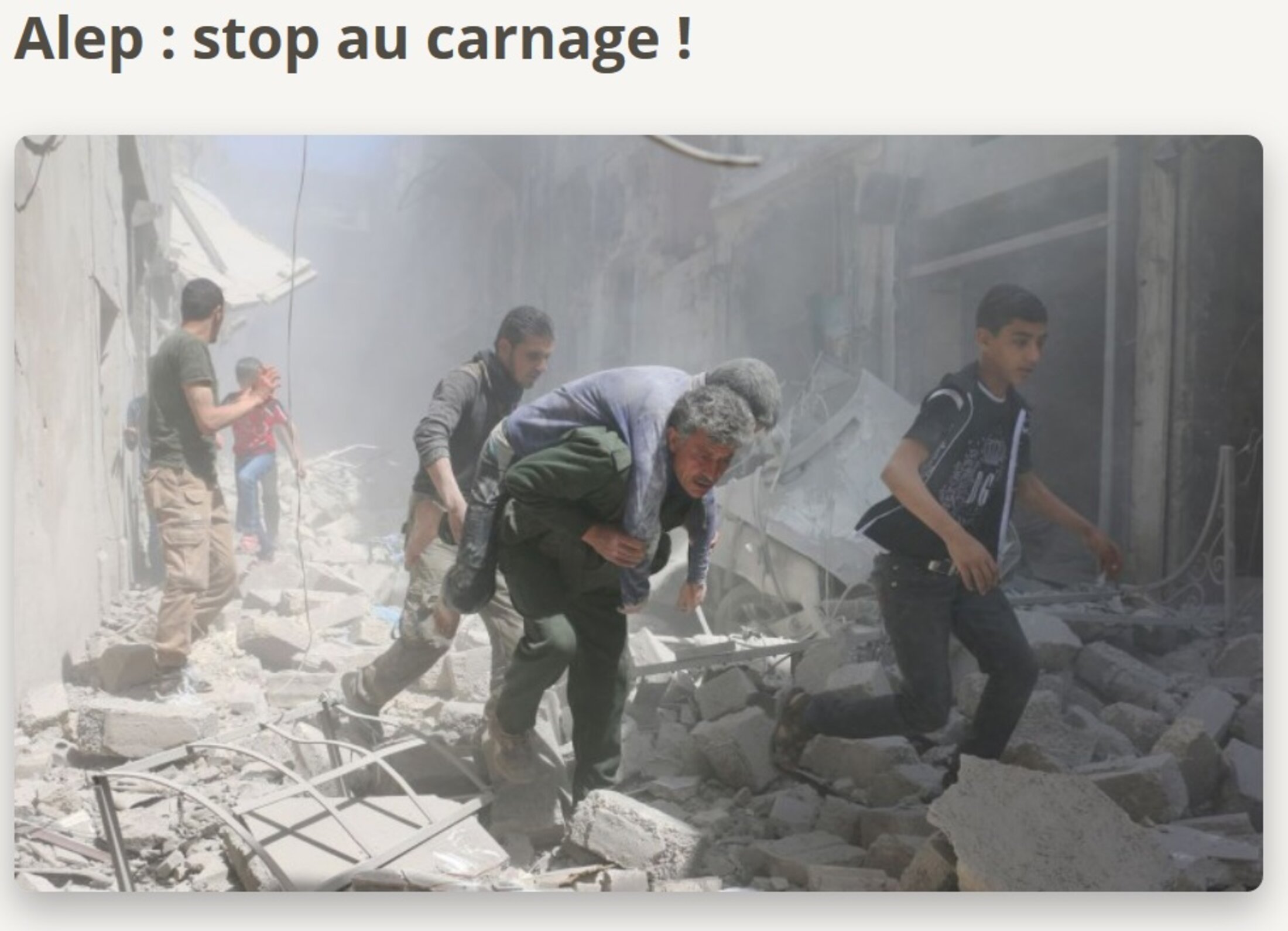 Il faut arrêter la main des bourreaux par une protestation générale de l'opinion publique. Il faut exiger l'arrêt immédiat des bombardements et des combats, pour permettre une aide humanitaire massive sous l’autorité de l'ONU et porter secours à la population d'Alep.