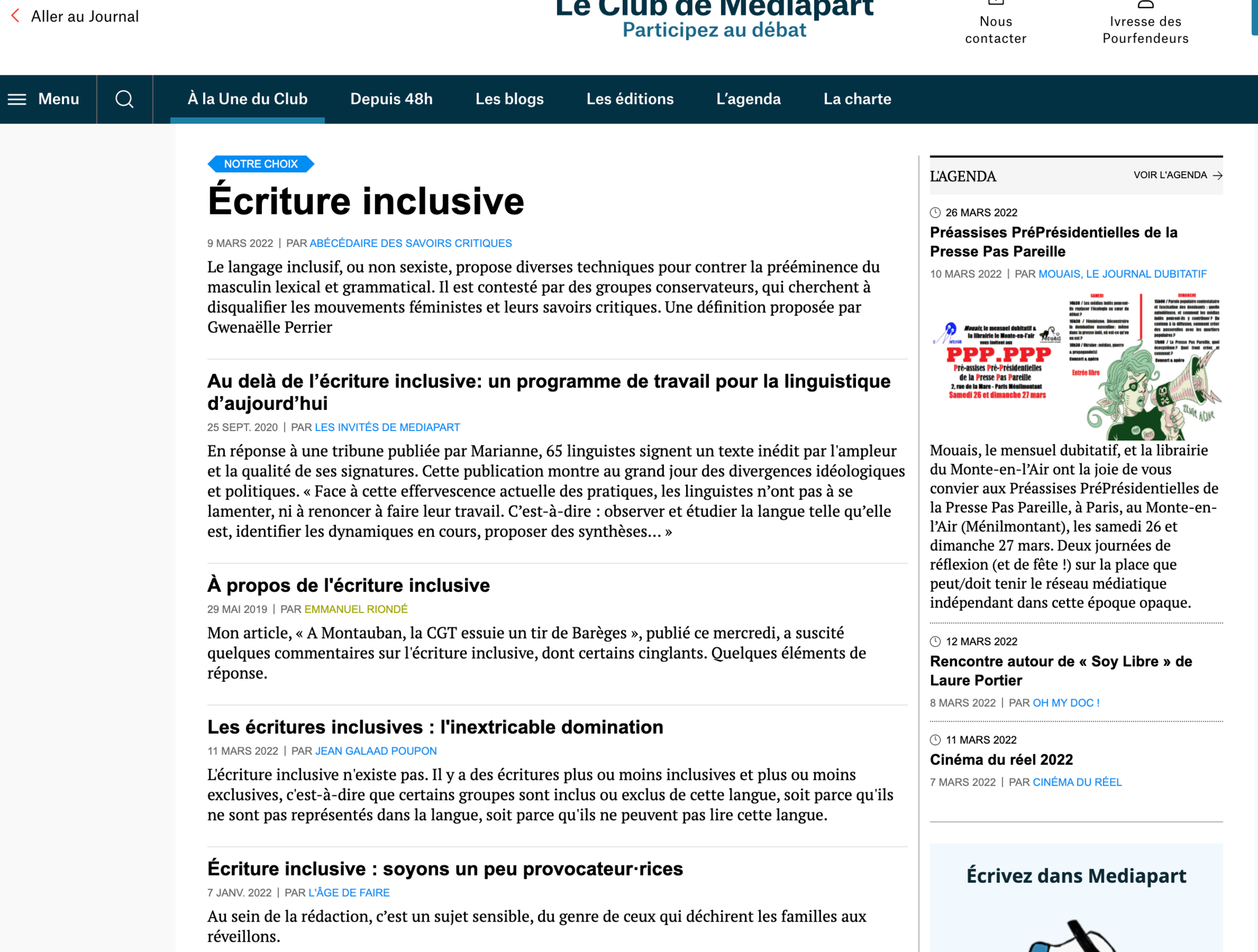La guerre fait rage en Ukraine, La Russie plonge l'Europe dans le chaos geopolitique, la pauvrete est toujours ce qui fait le plus de ravage a tous les etages en France, nous elisons un president dans 3 mois... Mais que se passe t il dans la tete de la personne qui a cru que le sujet clivant de l'ecriture inclusive etait ce sur quoi il fallait mettre nos neurones en route ce Dimanche matin ? Ce sont des choses comme celle ci qui la font prendre en grippe - cette ecriture inclusive - alors que la plupart d entre nous devrait s en foutre car elle n'est pas si derangeante que cela quand on veut bien etre raisonnable.