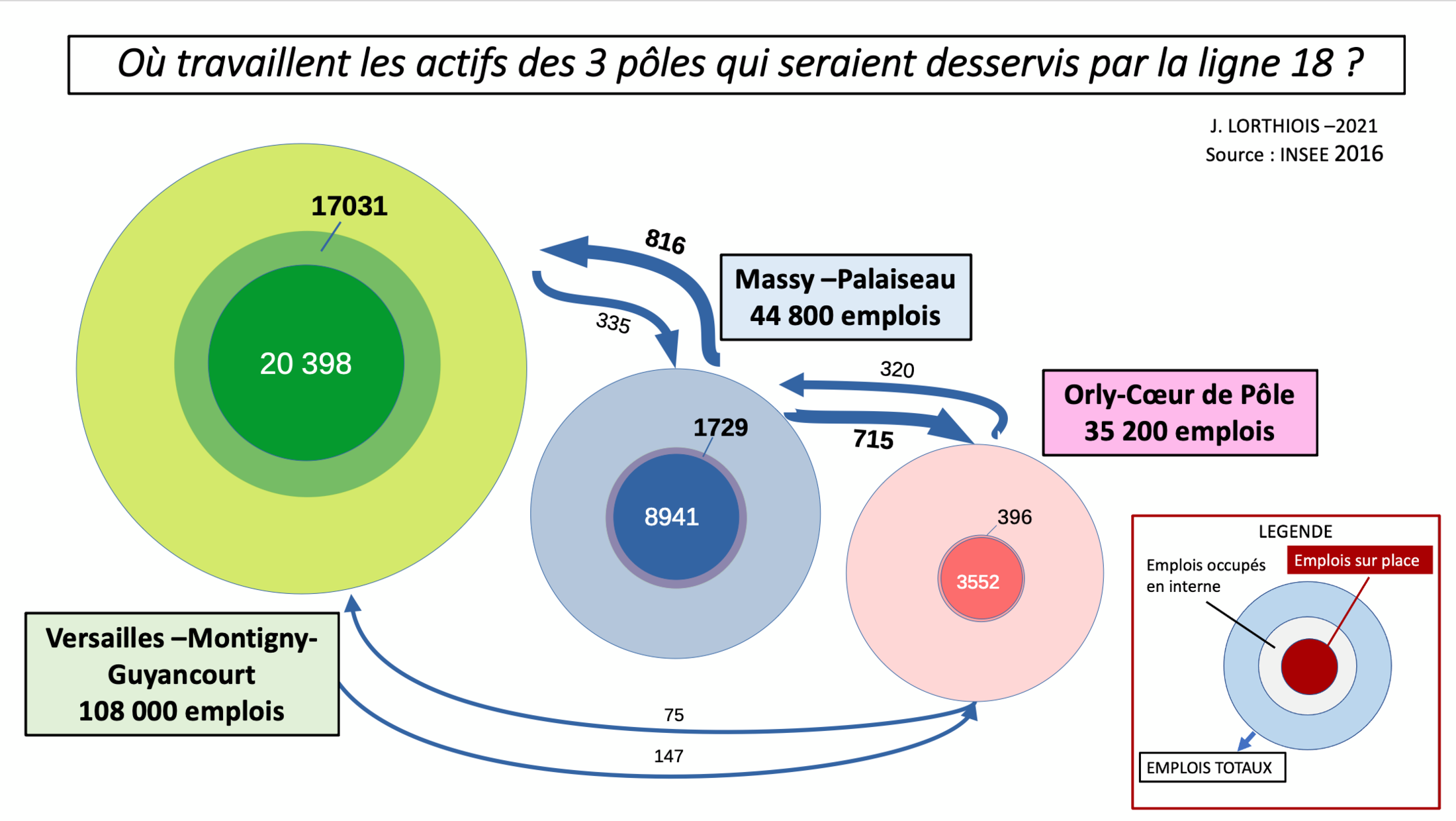 En synthèse, il y a très peu de liens entre ces 3 bassins qui sont organisés de façon totalement différentes, tant du point de vue de l’emploi que de la main d'œuvre. En conséquence, vouloir relier transversalement ces 3 bassins est une hérésie. J'ai déjà étudié la question lors de l’avis que j’ai exprimé dans le cadre de la dernière enquête publique [7]. Sur la carte ci-après que j’ai produite (figure 6) les données indiquées montrent que le long du tracé envisagé de la ligne 18, les flux de proximité (emploi sur place dans la commune de résidence, emplois en interne dans une autre commune du pôle) engendrés par les 3 pôles de centralité (Orly, Massy, Versailles) qui structurent les 3 bassins sont 21 fois supérieurs aux flux entre les pôles. On voit clairement que les besoins de transports portent d'abord sur de la desserte de proximité et non sur un grand axe de transit, qui traverse les territoires sans les desservir.