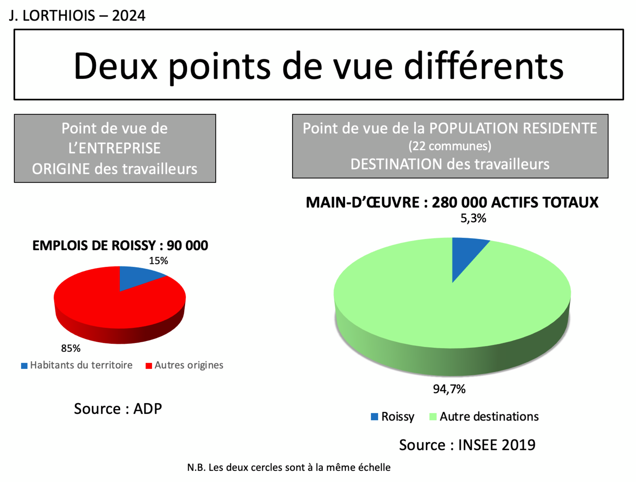 L’erreur statistique signalée en début d’article provient de deux points de vue opposés. Soit on adopte le point de vue de l’entreprise et on examine l’ORIGINE DES TRAVAILLEURS par rapport au nombre d’EMPLOIS localisés sur la plateforme aéroportuaire. Telle est l’explication de la phrase inexacte : « 15% d’actifs du Val d’Oise travaillent à Roissy ». En réalité, il faudrait dire « 15% des 90 000 actifs travaillant sur la plateforme aéroportuaire habitent le Val d’Oise ».