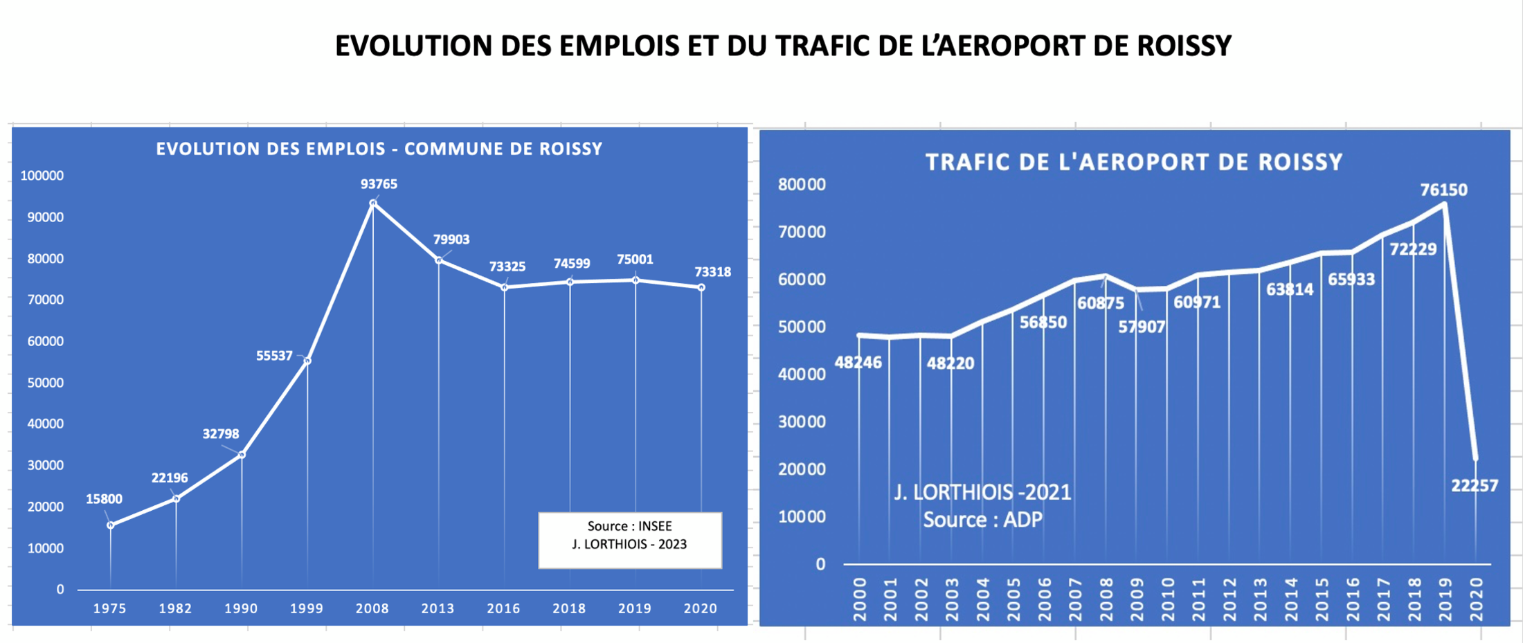 Certes, on me rétorque que les emplois localisés sur le pôle ne concernent pas seulement la commune de Roissy. Car la plateforme aéroportuaire s’étend sur 6 localités : principalement Roissy (95) et Tremblay-en-France (93) et plus accessoirement - par ordre alphabétique – Compans, Le Mesnil-Amelot, Mauregard et Mitry-Mory (toutes quatre dans le 77). Mais le recensement Insee - effectué à l’échelle communale - ne permet pas de distinguer la part des populations et des emplois qui est localisée dans le tissu urbain de ces municipalités, donc hors de l’emprise aéroportuaire. Déterminer la part réelle relevant du pôle au sein de ces 6 communes s’avère un exercice délicat. Si Roissy reste une modeste bourgade sans vie propre notable (2900 habitants, soit une population active totale[1] de 1800 personnes), il n’en est pas de même des villes de Tremblay (36 600 habitants) ou encore de Mitry-Mory (20 000) qui, en raison de leur poids démographique, génèrent un nombre appréciable d’activités de services aux habitants, sans rapport avec celles de l’aéroport. Il n’y a en effet aucune raison de considérer que des métiers induits par la population et localisés en centre-ville, comme artisan, petit commerçant, instituteur, assistante sociale, infirmière, personnel de mairie, etc. …auraient connu un développement imputable à la croissance du trafic aérien de Roissy-CDG. Il faut se méfier des modes de comptabilisation simplistes, indiqués aveuglément par un certain nombre de responsables politiques et administratifs.