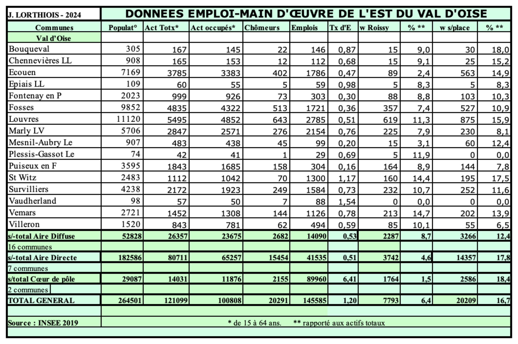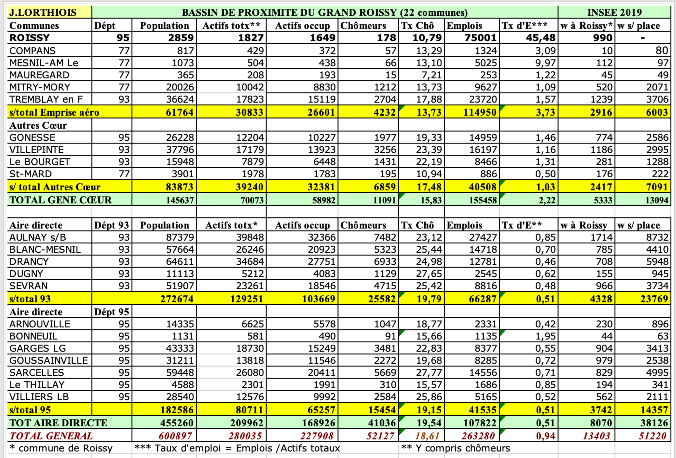 C’est le territoire que je prends en compte depuis une dizaine d'années, parce qu’il est souhaitable de conserver toujours le même périmètre, afin de mesurer les évolutions dans le temps. Cet espace a été déterminé en 2012, dans le cadre de l’étude « Estimation quantitative et qualitative des nouveaux emplois sur le territoire du Grand Roissy », effectuée par le cabinet-conseil ECODEV commanditée par l’EPA Plaine de France. A l'époque, le territoire du "Grand Roissy" regroupait 22 communes situées dans 3 départements, comprenant les 6 localités impactées par la plateforme aéroportuaire et 4 communes adjacentes faisant partie du « Cœur de pôle » (dont Gonesse), ainsi que les douze principales villes de ce qui a été appelé « l’Aire directe » du pôle de Roissy dans l'étude ECODEV - les communes les plus directement impactées par l'aéroport - . Elles sont 7 du Val d’Oise et 5 de l’intercommunalité Paris-Terres d’envol en Seine-Saint-Denis - (listées dans le tableau de la Figure 2). Soit un ensemble de 600 000 habitants, 280 000 actifs « totaux », dont 228 000 travailleurs occupés. A ne pas confondre avec le périmètre dit du « Grand Roissy – Le Bourget » (GRLB), instance administrative validée par la Région composée de 50 communes, soit l'addition depuis janvier 2016 de deux intercommunalités rivales qui ne travaillent jamais ensemble (les agglomérations de Roissy-Pays de France et de Paris-Terres d'envol). Un espace institutionnel beaucoup trop vaste pour correspondre à un "territoire vécu" par les habitants. Et pourtant promu comme "bassin de vie" dans le nouveau SDRIF, le schéma d'urbanisme et d'aménagement régional.
