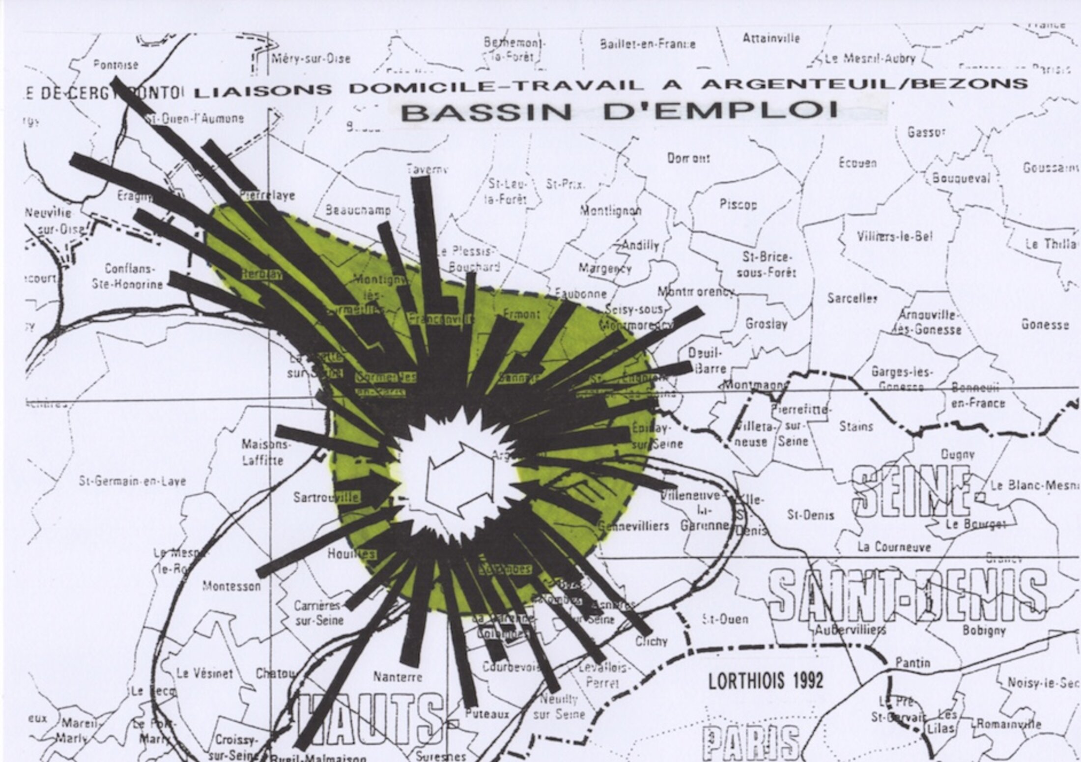 Sur la carte jointe (figure 1) du bassin de main-d’œuvre du pôle d’Argenteuil-Bezons, dessinée dans les années 90, on constate l’importance des liens historiques entre les deux rives industrieuses de la Seine, avec des flux d’actifs originaires des deux villes-sœurs localisées rive droite, à destination de la boucle de Gennevilliers et de la Défense élargie, situées sur la rive gauche d’en face.