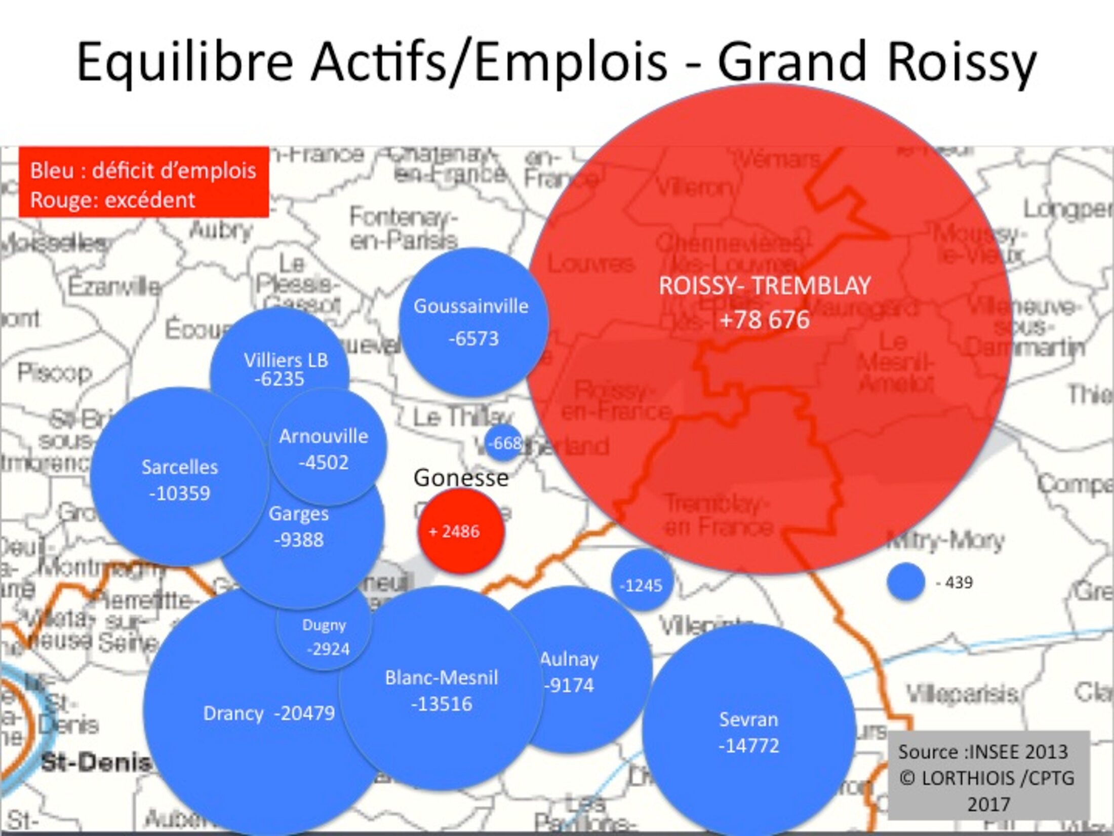Pour conclure sur le cas de Gonesse, on voit bien que l'amélioration de l’offre de transports avec la gare Triangle serait d’une très faible utilité pour les Gonessiens. Elle pourrait même les pénaliser, car les réseaux fonctionnant dans les deux sens, on constate des à présent à l’heure de pointe du matin des flux d'actifs débarquant à la gare du RER D Villiers le Bel / Arnouville / Gonesse (dans des conditions de confort bien meilleures, à contresens des trains bondés) et venant travailler à l'hôpital par exemple, en concurrence avec une main-d'oeuvre locale moins qualifiée et moins mobile. Situation paradoxale : Gonesse bien qu'excédentaire en emplois possède toutes les caractéristiques d'une commune dortoir, notamment avec un taux de chômage (16,8 %) à peine inférieur à celui de Goussainville (17,5 %) qui dispose pourtant de deux fois moins d'emplois que d’actifs. Et les Gonessiens subissent une double peine : la faible présence des populations dans la journée entraîne un développement médiocre d'emplois dits «présentiels» (liés à la présence d'habitants sur place : petits commerces, artisanat, services à la personne, emplois publics, économie sociale et solidaire). Il est donc illusoire d'implanter toujours plus d'activités décalées avec les compétences et qualifications des résidents. Exactement le cas du pôle d’emplois ultra-spécialisé de Roissy, ou des grands équipements métropolitains de type Europacity ou Disneyland, comme nous l'avons démontré aux chapitres 3 et 4.