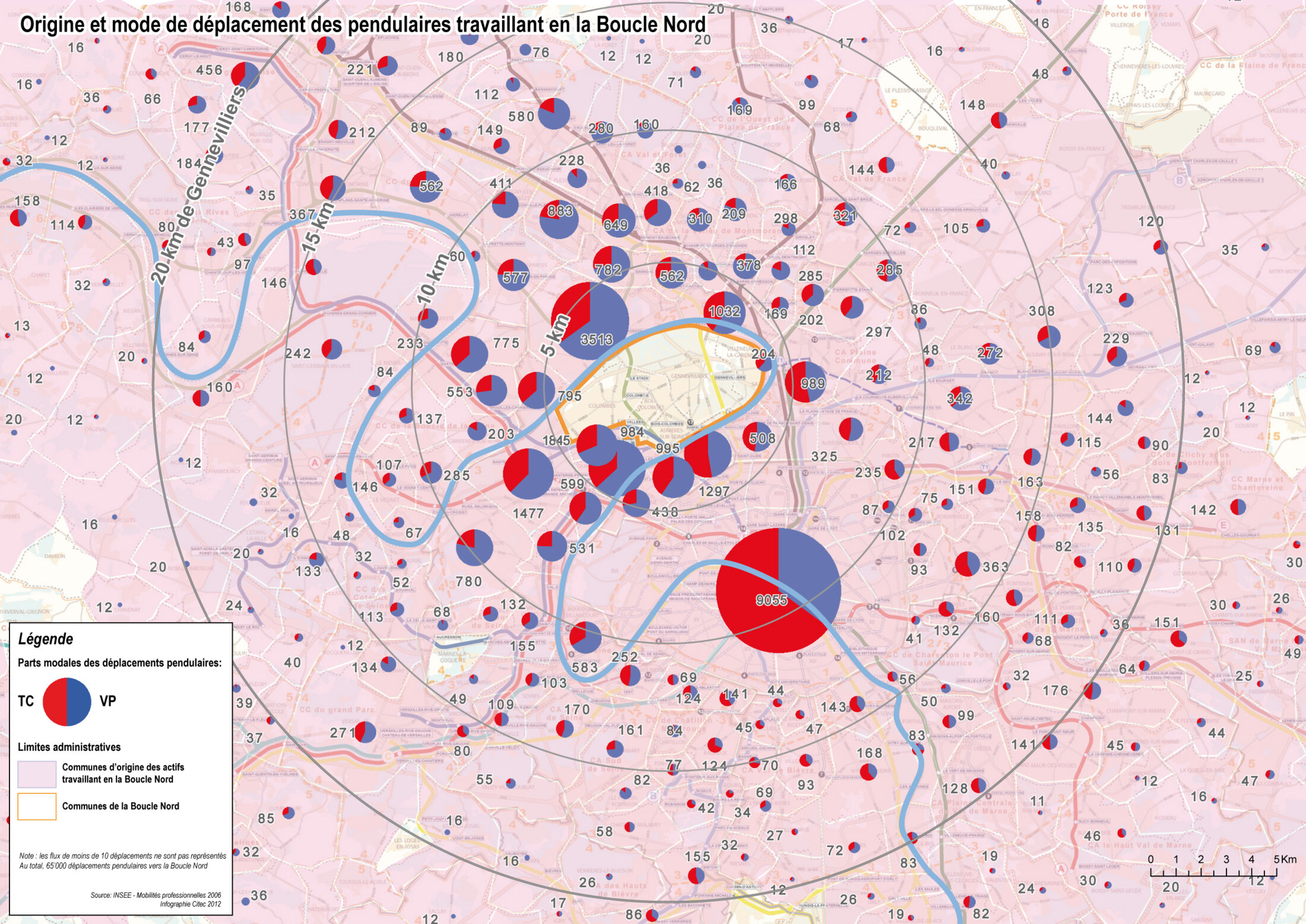 Sur la deuxième carte jointe (figure 2), établie en 2012 par le bureau d’études CITEC dans le cadre des études préalables au Contrat de Développement Territorial «Boucle Nord 92»(3), on constate l’apport significatif des travailleurs originaires de la rive droite pour les entreprises du territoire gennevillois, notamment la ville d’Argenteuil qui fournit à elle seule 3500 actifs, sans compter les communes de son aire d'attraction.