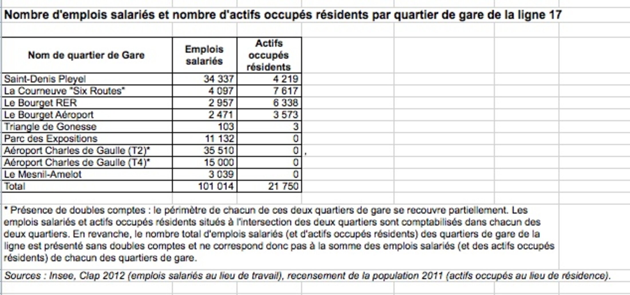 Force est de constater que l'ensemble de la ligne 17 Nord ne dessert que des pôles d’emplois entre eux (Le Bourget, Triangle de Gonesse, Parc d’Expositions de Villepinte, Roissy aéroport, sans compter le développement escompté de la commune de 800 habitants du Mesnil-Amelot), ce qui représente une partie infime des besoins des populations. La dernière Enquête Globale des Transports Ile de France (EGT 2010) estime les liaisons entre pôles d’emplois à 3% de la demande régionale. La fonction essentielle des transports en commun étant de relier des bassins d’habitat à des pôles d’activités, car les liaisons domicile-travail sont les plus contraintes (heures de pointe qui conditionnent la capacité des réseaux), les plus distantes (11) et les plus coûteuses en finances et en temps.