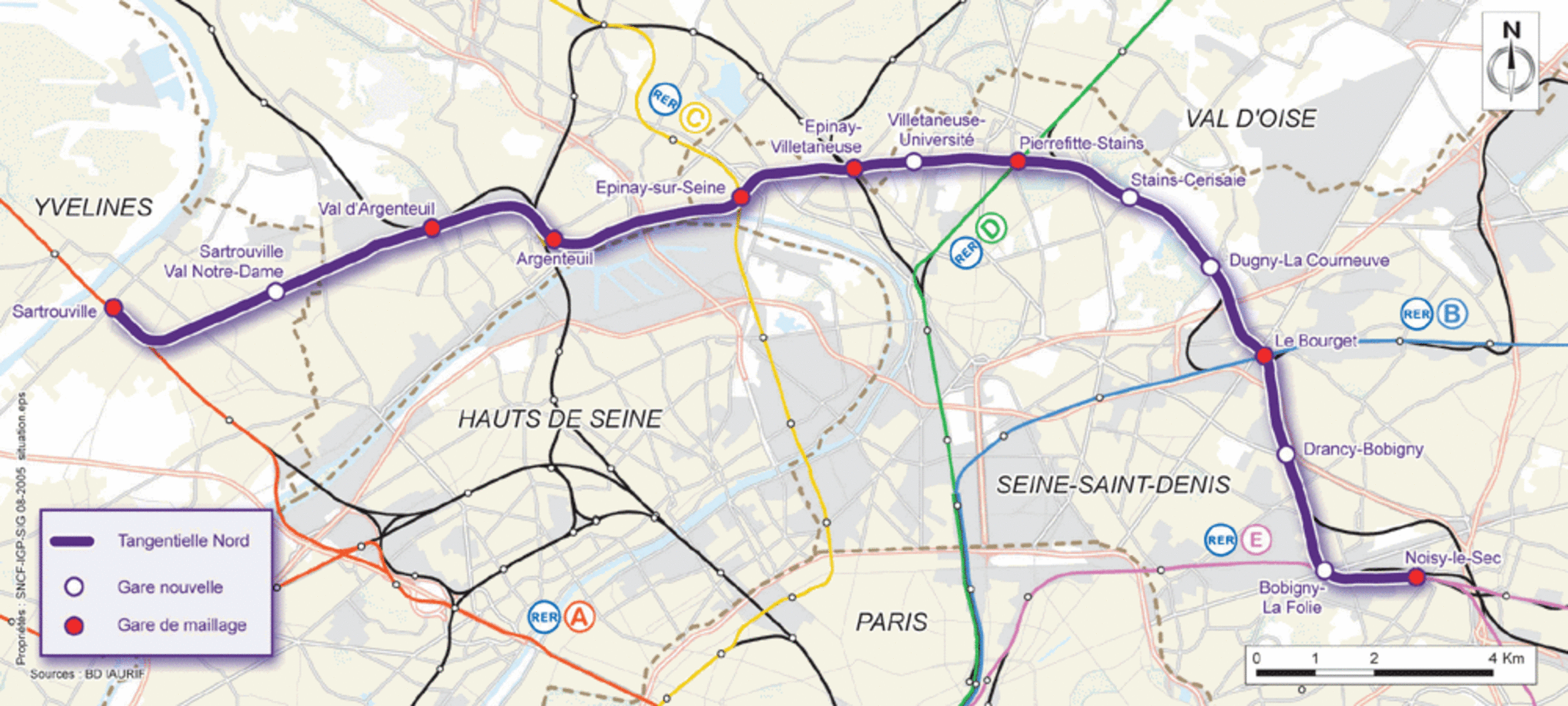 Par ailleurs, la programmation régionale de transports en commun lourds ne se limite pas à la seule réalisation du Grand-Paris-Express. Il existe aussi un «Plan de Mobilisation de la région Ile-de-France» qui prévoit des lignes complémentaires. Et notamment le bouclage du tram-train 11 express plus connu sous le nom de "Tangentielle Nord" dont un seul tronçon Épinay-sur-Seine /le Bourget est actuellement en service (voir carte figure 5). Fonctionnant exclusivement en aérien, utilisant un tracé existant (ancienne Grande Ceinture) il suffirait de 800 millions pour 17 kms (dont 7,5 kms dans le Val d’Oise), dans des délais bien plus courts. Son achèvement permettrait la réalisation du tronçon ouest Sartrouville/Argenteuil/Épinay-sur-Seine, et du tronçon est vers Noisy-le-Sec. L’ensemble de la ligne 11 express desservirait 627 000 habitants, dont 27 quartiers de renouvellement urbain classés ANRU. Côté ouest, le tronçon traverserait des zones du Val d’Oise fortement urbanisées, avec deux gares remarquablement situées, l’une au cœur d'un des plus grands quartiers sensibles d'Ile-de-France, le Val d'Argent (50 000 habitants) et l’autre en plein centre-ville d'Argenteuil.