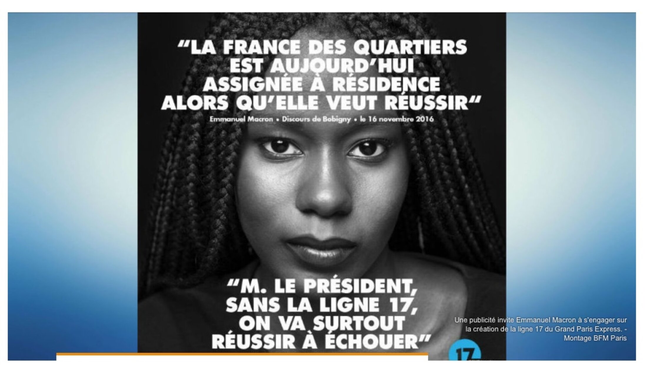 Cette déclaration, bien que réclamant de «sortir de la caricature», constitue elle-même un tissu de contre-vérités. A en croire son auteur, Europacity serait un projet quasiment «caritatif » destiné à faciliter la vie des habitants, alors que la situation excentrée de la gare n'est guère en mesure de fournir les services prétendus aux populations. L’affirmation que les résidents de l'est du Val d'Oise seraient obligés de prendre le RER D jusqu'à la gare du Nord, pour remonter ensuite via le RER B jusqu'à Roissy pour aller y travailler (soit une heure et quart de trajet), est totalement mensongère, puisqu’une nouvelle ligne de bus n°20, aux ¾ en site propre, a été inaugurée (par le président du département !) dès septembre 2016, effectuant une liaison interdépartementale en moins d’une demi-heure. Cette affabulation a pourtant été reprise - un an après la mise en service de la ligne 20 - dans une publicité largement diffusée dans les médias le 17 Octobre 2017 (figure 6), venant appuyer quelques jours plus tôt une manifestation devant Matignon d’élus du 95, 93 et 77, qui réclamaient le «maintien du tracé et des délais» de la ligne 17 Nord. L’image reprend en exergue une phrase d’un discours d’Emmanuel Macron à Bobigny, le 16 novembre 2016 : « La France des quartiers est aujourd’hui assignée à résidence, alors qu’elle veut réussir »… Et une jeune fille en gros plan interpelle le chef de l’État : « Monsieur le Président, sans la ligne 17, on va surtout réussir à échouer». Le texte d’accompagnement reprend encore la même fable : « Nous vivons une discrimination territoriale qui nous empêche de rejoindre une ville voisine sans passer par les gares parisiennes. »