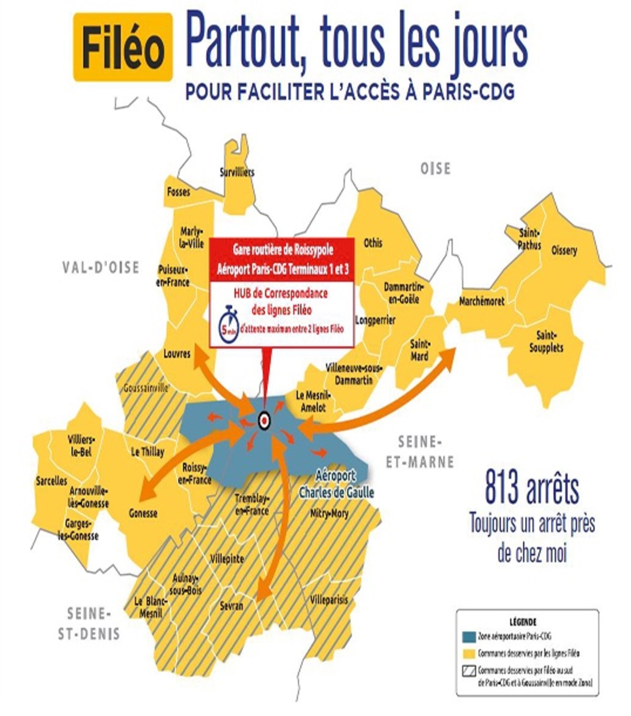 - 3/ un système de « bus à la demande » intitulé Filéo (voir carte figure 8), avec une offre 24 H /24 et 7j /7 constitue un mode de transport particulièrement adapté aux caractéristiques des emplois de Roissy, dont 70% sont « postés », c’est-à-dire fonctionnant en continu.