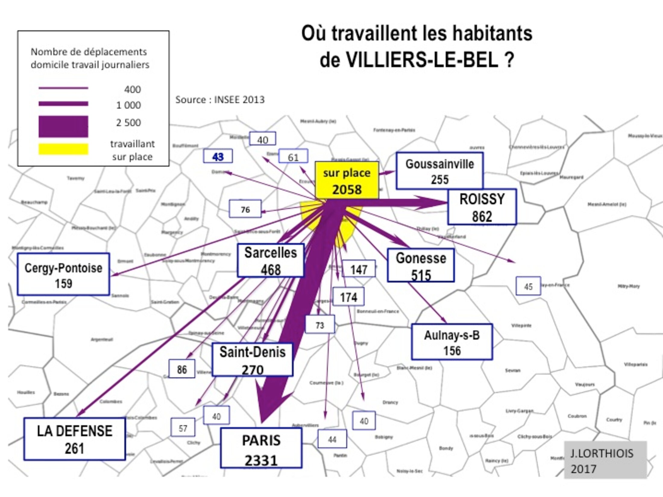 Cette fois-ci, il s’agit d’une commune-dortoir au sens concret du terme, fortement déficitaire en emplois (5900 postes) par comparaison avec la population active occupée (9800 travailleurs), a fortiori en rajoutant les chômeurs (12 200 habitants en activité ou en recherchant une), soit 2 actifs pour un emploi. Sur la carte du bassin de main-d’œuvre jointe (figure 13), on constate la faible attraction du pôle de Roissy qui n’occupe que 5,6% des actifs occupés : les travailleurs venant en transports en commun sont desservis correctement par 3 lignes de bus dont un BHNS. Les habitants qui travaillent à Gonesse peuvent utiliser la ligne de bus 20 côté Val d’Oise. Certains des actifs vers Arnouville peuvent même s’y rendre à pied. Mais les plus gros flux se dirigent vers le Sud, à commencer par Sarcelles, pôle principal de rattachement de proximité (5,8% des travailleurs Beauvillésois), auquel on peut adjoindre les destinations de Garges-lès-Gonesse et Saint-Denis, via le RER D. Mais surtout, on constate que 12% des grands flux rejoignent Paris, avec un record de 400 personnes vers Saint-Lazare. C’est pourquoi le prolongement de la ligne 14 jusqu’à Saint-Denis-Pleyel serait fort utile aux populations locales. De même, la prolongation du tramway T5 Sarcelles-Villiers-le-Bel pourrait consolider les liens entre ces deux villes, qui forment une même continuité urbaine. Par contre, il n’y a aucune justification pour les Beauvillésois ni du barreau de Gonesse, ni de la gare du Triangle et plus généralement de la ligne 17 Nord. A l’inverse, l’achèvement du tram-train intitulé 11 express pourrait offrir de nouvelles opportunités aux habitants.
