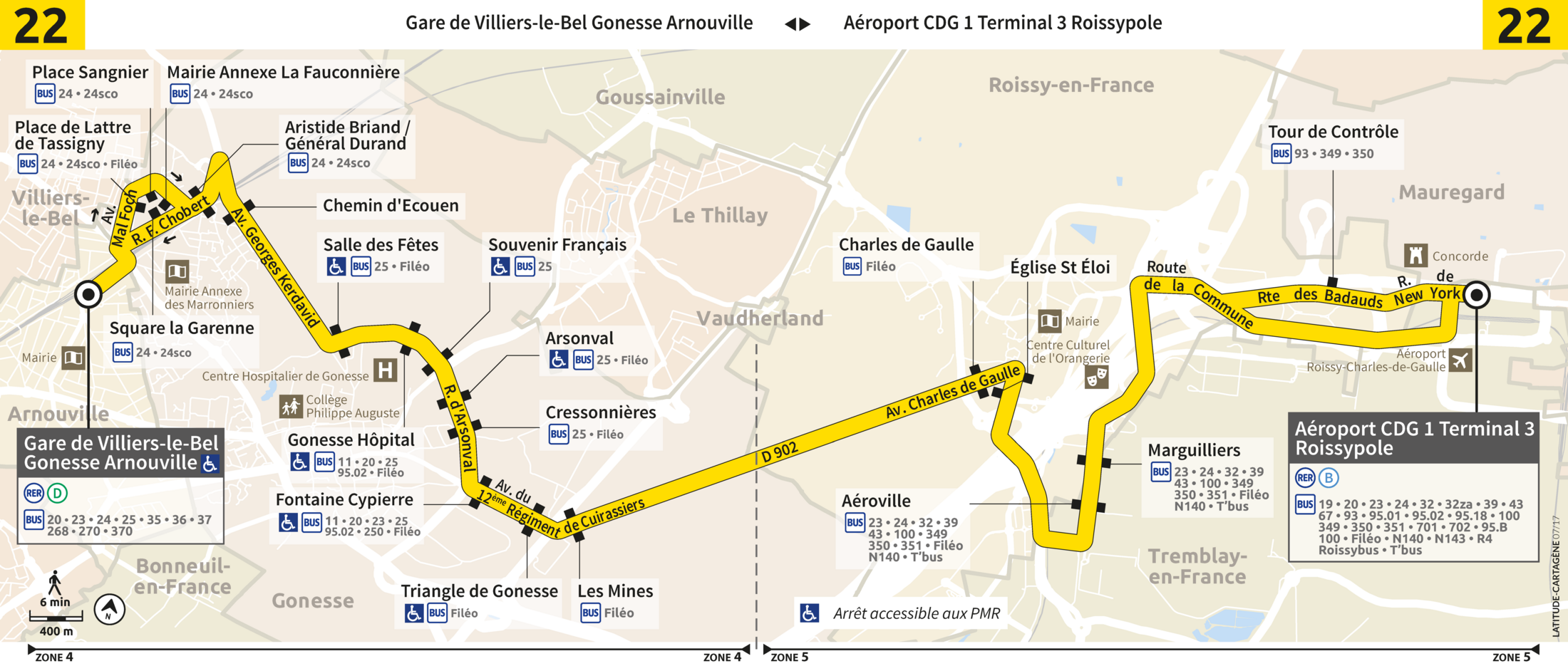 - 2/ le bus 22 permet d’aller directement à Roissy via le CD 902, en une trentaine de minutes (voir carte figure 7).