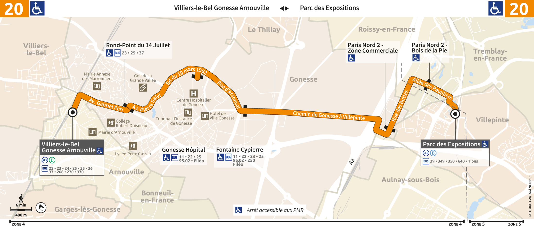 - 1/ le bus 23 empruntait un itinéraire partant de la gare RER D « Villiers-le-Bel / Arnouville / Gonesse » (Val d’Oise), jusqu’à la gare «Parc des Expositions » (Villepinte, Seine-Saint-Denis), permettant d'atteindre ensuite Roissy via le RER B en une station, soit 50 minutes au total ;