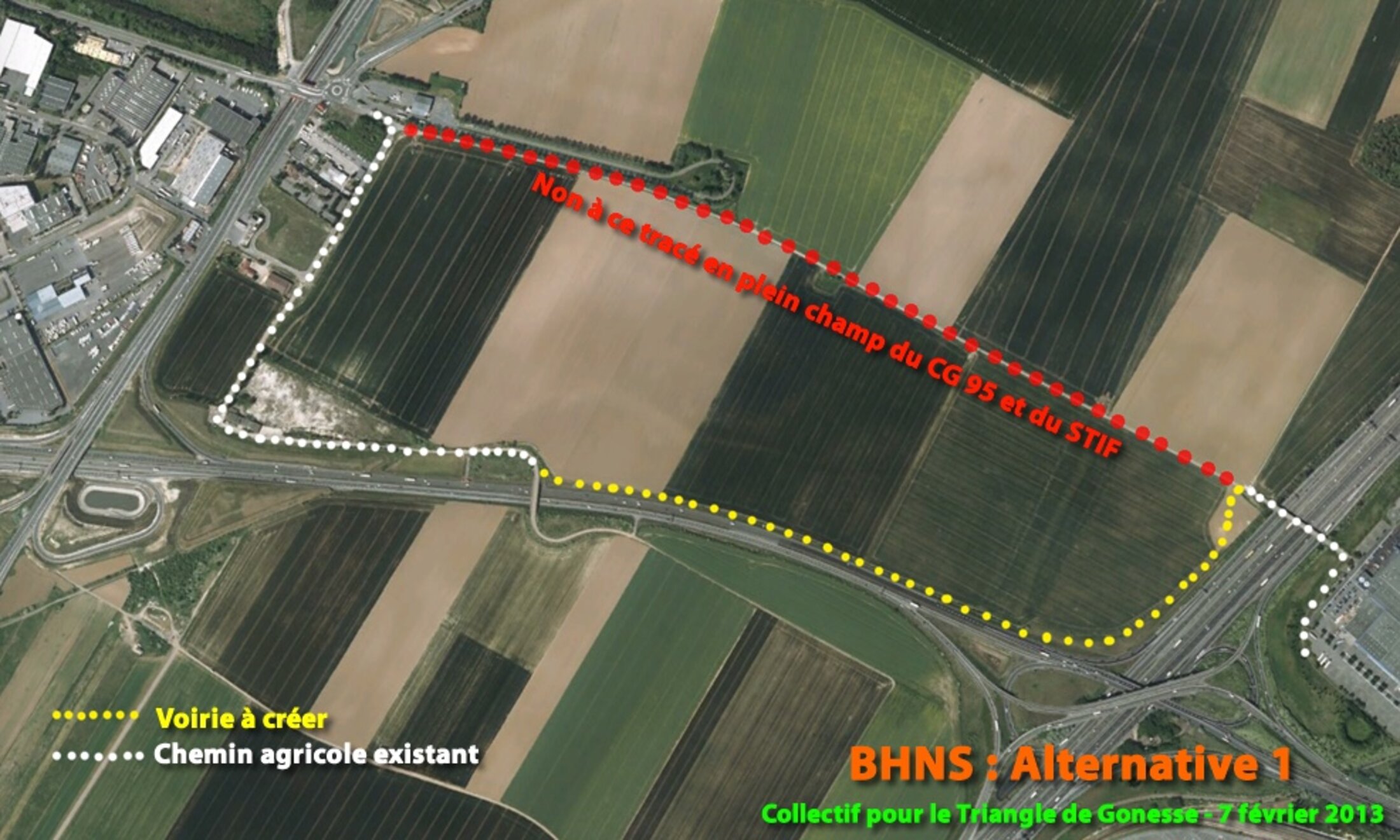 Dans un premier temps, le STIF (8) a décidé de financer un «Bus à Haut Niveau de Service» (BHNS) censé préfigurer ce barreau dès 2014. La liaison ferroviaire restait programmée pour 2017, inscrite au Contrat de Plan État-Région pour 200 millions. Le CPTG favorable à ce BHNS, avait toutefois proposé un tracé plus au sud (voir pointillés blancs sur la carte aérienne ci-après) longeant le Boulevard Intercommunal du Parisis (BIP), pour éviter la traversée d’une route en plein cœur des terres agricoles. Cette solution alternative fut refusée, au motif qu'elle allongeait la durée du trajet de 3 minutes.