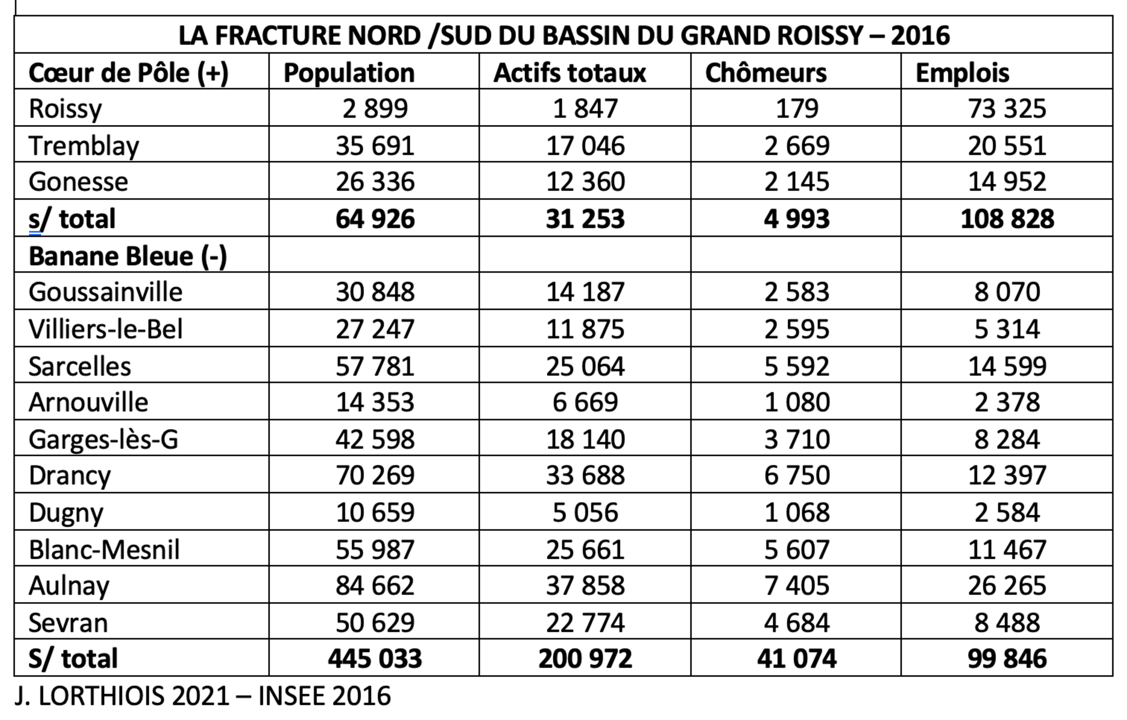 Mais revenons à notre Banane Bleue. On voit clairement sur l’illustration ci-dessus (figure 1) aux soldes fortement contrastés, que la fracture territoriale dont souffre le bassin n’est pas est/ouest, comme le prétendent la présidente du Conseil Départemental et la plupart des élus de l’Est-95, mais nord/sud et qu’elle est transversale à la frontière départementale. Ce qui vient contredire le discours misérabiliste des élus val d’oisiens se plaignant d’une Seine-Saint-Denis qui aurait « tout » et d’un Val d’Oise qui n’aurait « rien ». Venant accréditer l’idée d'une nécessité de compenser une injustice territoriale aussi flagrante, par une décision politique revendiquant comme unique remède l’urbanisation du Triangle de Gonesse, avec l’implantation d’activités et d’emplois en nombre et d’une gare de métro, déclarée sans preuve « à l’usage des habitants du Val d’Oise ». Comme si la suppression d’Europacity avait créé une « dette » de l’État (c'est-à-dire les contribuables), se devant de réparer sa décision injuste par un acte significatif de remboursement avec un nouveau grand projet « d’ambition métropolitaine » sorti du chapeau (inutile de prévoir le lapin, il en habite sur place), sur le lieu même du « crime de lèse-territoire » : le fameux Triangle de Gonesse, dont le bétonnage serait seul en capacité de sortir les populations résidentes (problème = il n’y en a pas !) de la pauvreté et du chômage. Et comme si la mauvaise localisation de feu le mégacomplexe abandonné... n’était pas entré en ligne de compte dans les raisons de cette annulation.