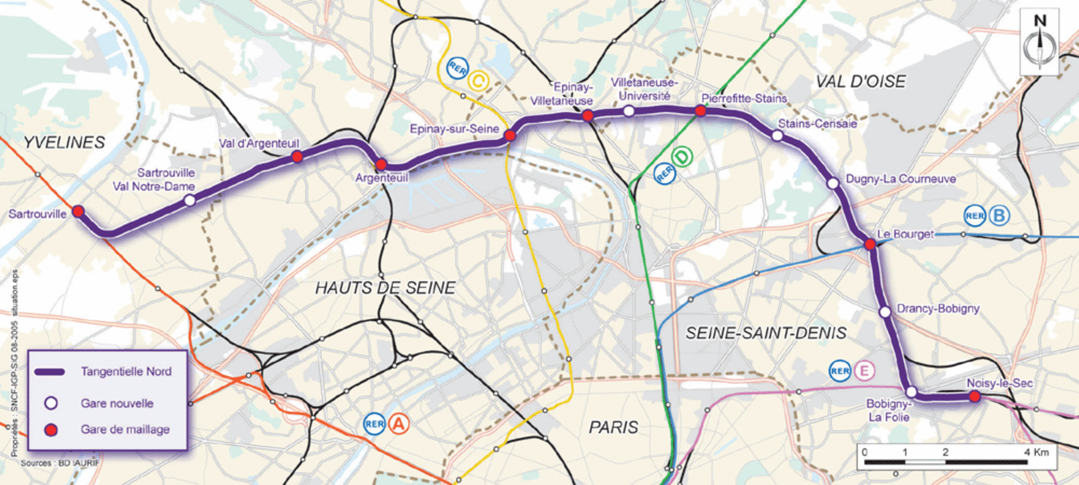 Le tram-train qu’on appelle aujourd’hui T11 portait autrefois le nom de « Tangentielle Nord ». Il s’agit d’une liaison banlieue/banlieue en rocade, utilisant l’ancienne infrastructure SNCF qu’on appelait « Grande ceinture », dans sa partie reliant les banlieues nord de la zone dense. Sur la carte jointe (Figure 1), on voit que le tracé fait 28 km au total, joignant 3 départements, depuis Sartrouville (78), puis Argenteuil (95) et Épinay-sur-Seine (93), jusqu’au terminus Noisy-le-Sec (93). Un grand avantage de la ligne est d’être située entièrement sur la rive droite de la Seine, ce qui permet d'échapper aux méandres du fleuve, évitant les ouvrages importants et parfois plusieurs traversées successives.