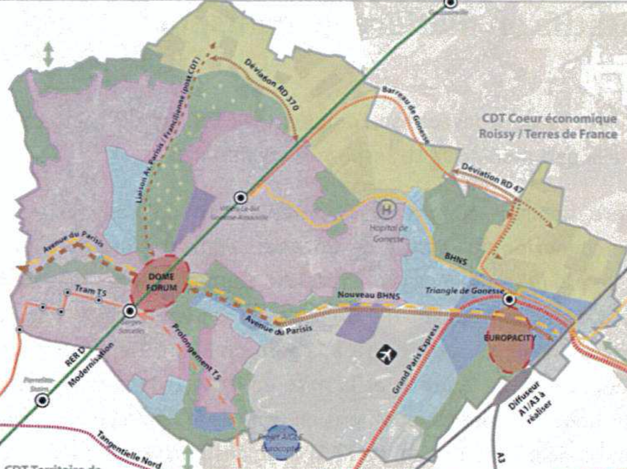 Ainsi, en 2013, à l’aube de la mise en place des grandes réformes territoriales (lois MAPTAM et NOTRe), ces deux ensembles disparates Roissy-Porte de France et Val-de-France constitués au gré d’alliances par accointances et/ou rivalités politiques, mais sur une base commune d’intérêts financiers ne représente en rien ce qu’on appelle des « territoires vécus »[9] par les populations. Les négociations s’effectuent entre élus de même couleur (ou de couleur opposée pour éliminer un rival) qui se répartissent (ou se disputent) les places et à aucun moment les habitants ne sont consultés. Les élus défendent des grands projets métropolitains « bling-bling » de type Europacity, le Dôme ou My Place à Sarcelles, ou encore un grand pôle de bureaux à Roissy sur la plateforme, intitulé « World Trade Center », vite rebaptisé fin 2011 « International Trade Center » toujours à l’état virtuel aujourd'hui [27].