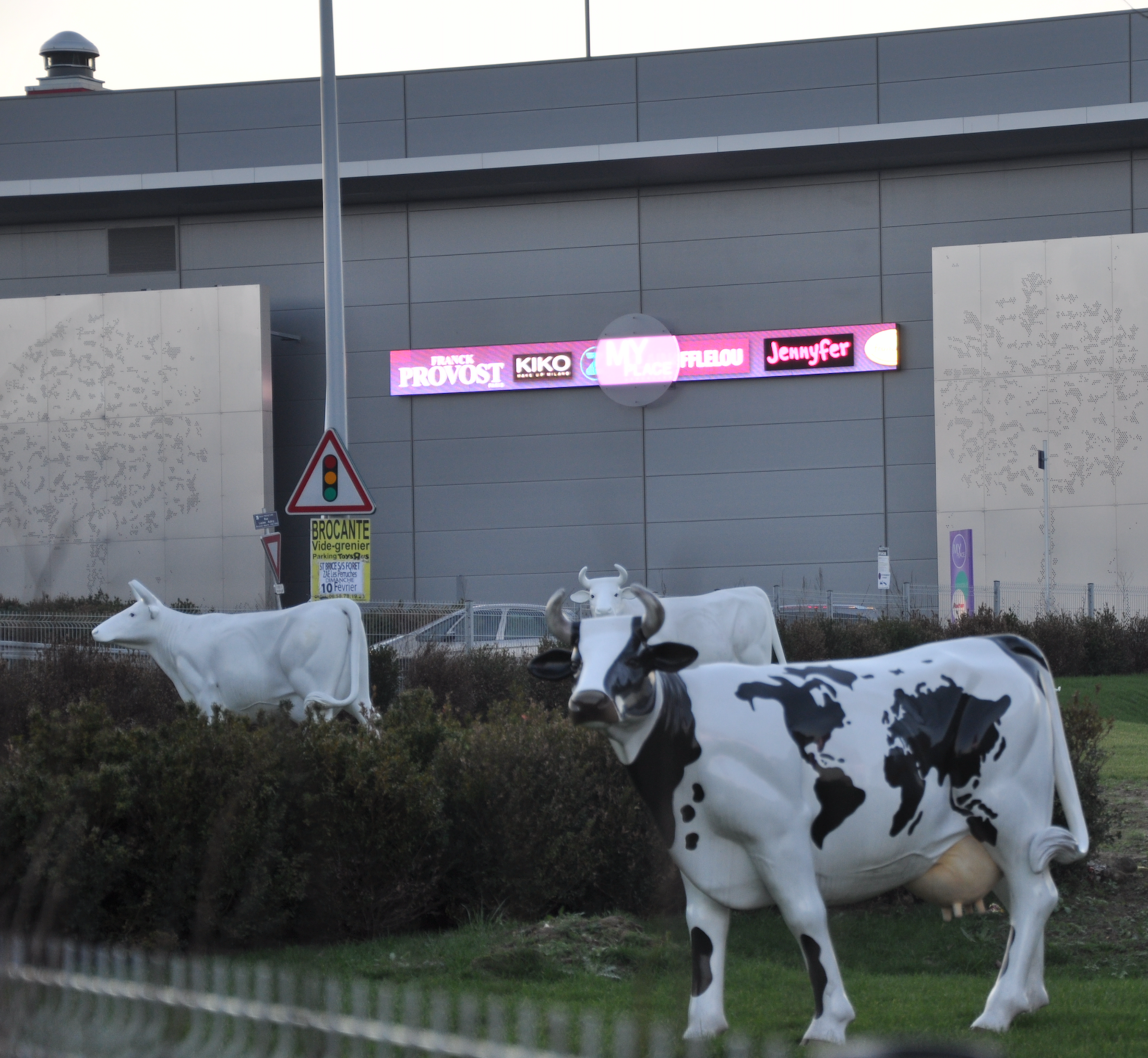 Nous ne revenons pas sur le giga-complexe de commerces et de loisirs Europacity promu par le maire de Gonesse, qui a fait l’objet de nombreux articles de ce blog [24]. Mais nous observons que le même syndrome de « granditude inutile [25] » sévit à Sarcelles. Pour accueillir le Dôme, il est envisagé sans état d’âme de sacrifier un vaste espace foncier, proche de la gare du RER : un projet peu créateur d’emplois, concurrent d’un équipement semblable programmé à Tremblay-en-France en Seine-Saint-Denis (Le Colisée) porté par François Asensi, alors député-maire communiste (36 ans député, actuellement détenteur d’un 6ème mandat de maire). Pendant ce temps, le cœur de ville de Sarcelles se désertifie, avec la fermeture progressive du centre commercial des Flanades détenu par l’enseigne Leclerc qui jette l’éponge, à l’annonce de l’implantation d’un centre commercial flambant neuf en périphérie de la zone dense, au nom peu couleur locale de « My Place » porté par la foncière Compagnie de Phalsbourg avec l’hypermarché Auchan en locomotive, inaccessible aux populations sans véhicule. Dérision suprême : des fausses vaches grandeur « nature » - si l’on peut dire - broutent un maigre gazon au pied de ce quadrilatère bunkerisé de béton gris, un exemple de laideur paysagère caractérisant de nombreuses entrées de ville, dont témoigne la Figure 4 (nous sommes en pleine bagarre contre Europacity et la société immobilière du groupe Auchan qui détruirait 80 ha d'excellentes terres agricoles à quelques encablures !). Résultat de cette course au gigantisme : la faiblesse du nombre d'emplois sur place et la concentration de l'offre d'activités sur quelques filières de métiers en tension obligent l’essentiel des actifs du bassin de Sarcelles à quitter chaque jour le territoire (tout comme leurs congénères de Roissy-Pays de France) pour aller travailler au sud, subissant la galère du RER D pour rejoindre le bassin de Saint-Denis, et surtout Paris. Contrairement à la fable qui continue d’être affirmée à longueur de discours, il n’est absolument pas nécessaire d’emprunter ce même RER D pour aller à Paris et rejoindre ensuite Roissy via le RER B (on se reportera utilement à d'autres articles de ce blog qui réfutent cette intox)[26]. Piètre consolation pour les opposants au « tout-béton » : le projet de Dôme est abandonné dès sa conception.