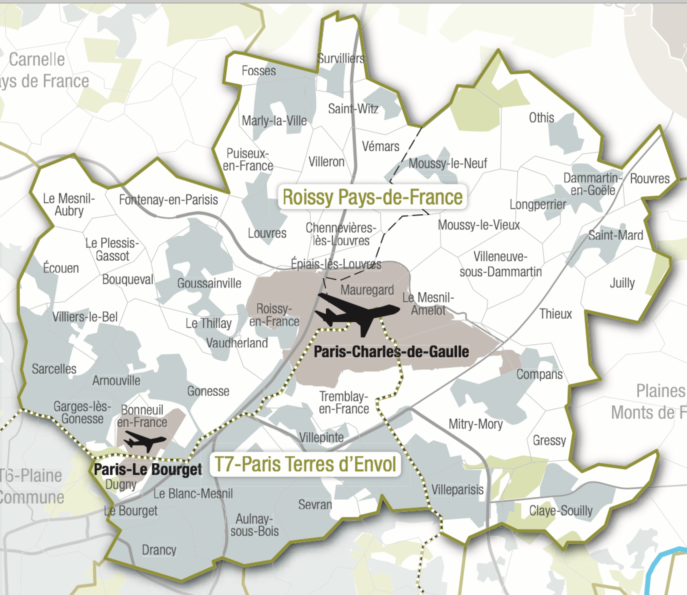 Comble d’aberration : on observe en Ile-de-France que les pôles de développement éminemment métropolitains que constituent les aéroports internationaux… n’ont pas bénéficié au nord et au sud de la région d’un statut identique dans leur intégration à la Métropole [10]. Au sud du Val-de-Marne, le pôle d'Orly localisé dans la MGP, s’est vu rattacher une petite partie de son bassin de main-d’œuvre du nord Essonne (quelques communes du Val d’Orge). A l’inverse, ce qu’on appelle le « Cœur de pôle de Roissy »[11] est resté divisé entre trois départements et ne fait pas partie de la Métropole. Et la communauté d’agglomération Roissy-Pays de France (350 400 habitants) représente désormais une entité en grande couronne sensiblement de même taille que sa voisine côté Seine-Saint-Denis « Paris Terres d’envol » (T7, 361 000 habitants). Alors que ces deux territoires, séparés désormais par une double frontière départementale et métropolitaine, appartiennent à un même espace géographique et historique : le Pays de France. Pour comprendre le processus d'élaboration d'un tel imbroglio spatial, il convient de rappeler l’historique de la constitution des alliances intercommunales qui se sont jouées dans l’Est-95, puis avec le Nord-Ouest-77.