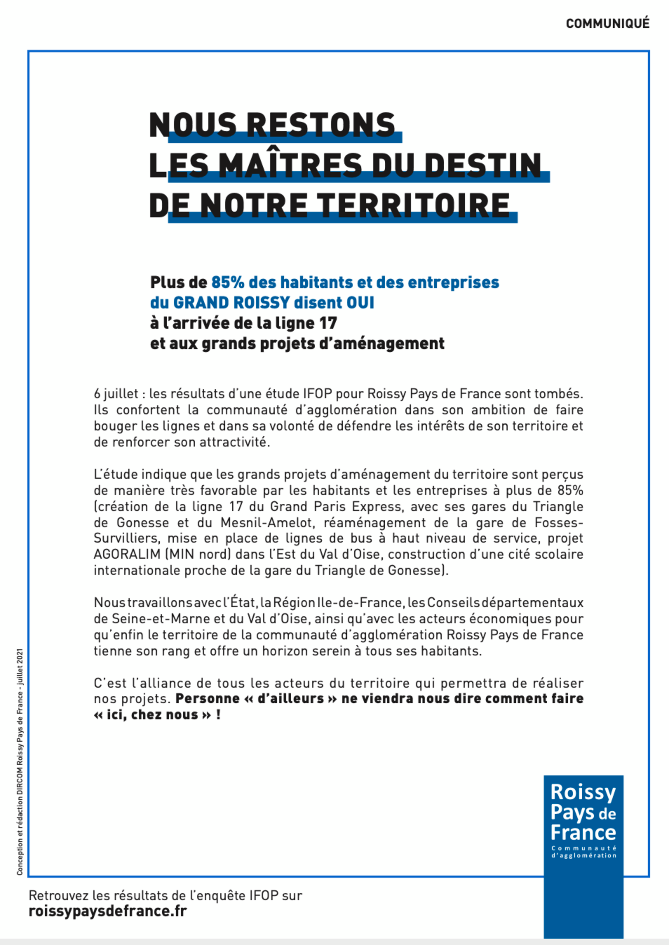 Cet été, un communiqué publicitaire porté par l’agglomération Roissy-Pays de France a fleuri dans la presse (Figure 8). Il se glorifiait des résultats d’un sondage IFOP, affichant 85 % des interviewés favorables à l’urbanisation du Triangle de Gonesse. Mais l’histoire locale nous a appris la valeur de certains sondages. (Voir mon article sur les manipulations statistiques d'Odoxa en faveur d'Europacity [62]). Au vu de ces résultats, Pascal Doll, président de la CARPF, se sent suffisamment conforté pour affirmer son positionnement : « personne "d’ailleurs" ne viendra nous dire comment faire, ici, chez nous ». Sous-entendu : les Collectifs de militants qui s’opposent à la bétonisation du Triangle et qui viennent de différents sites en lutte d’Ile-de-France (dont le Pays de France lui-même) n’auraient aucune légitimité pour parler au nom des populations, alors que notre contestation est devenue un symbole national de l’ensemble des combats contre les GPII, notamment au sein de notre région (on nous surnomme le « Notre-Dame des Landes » francilien).