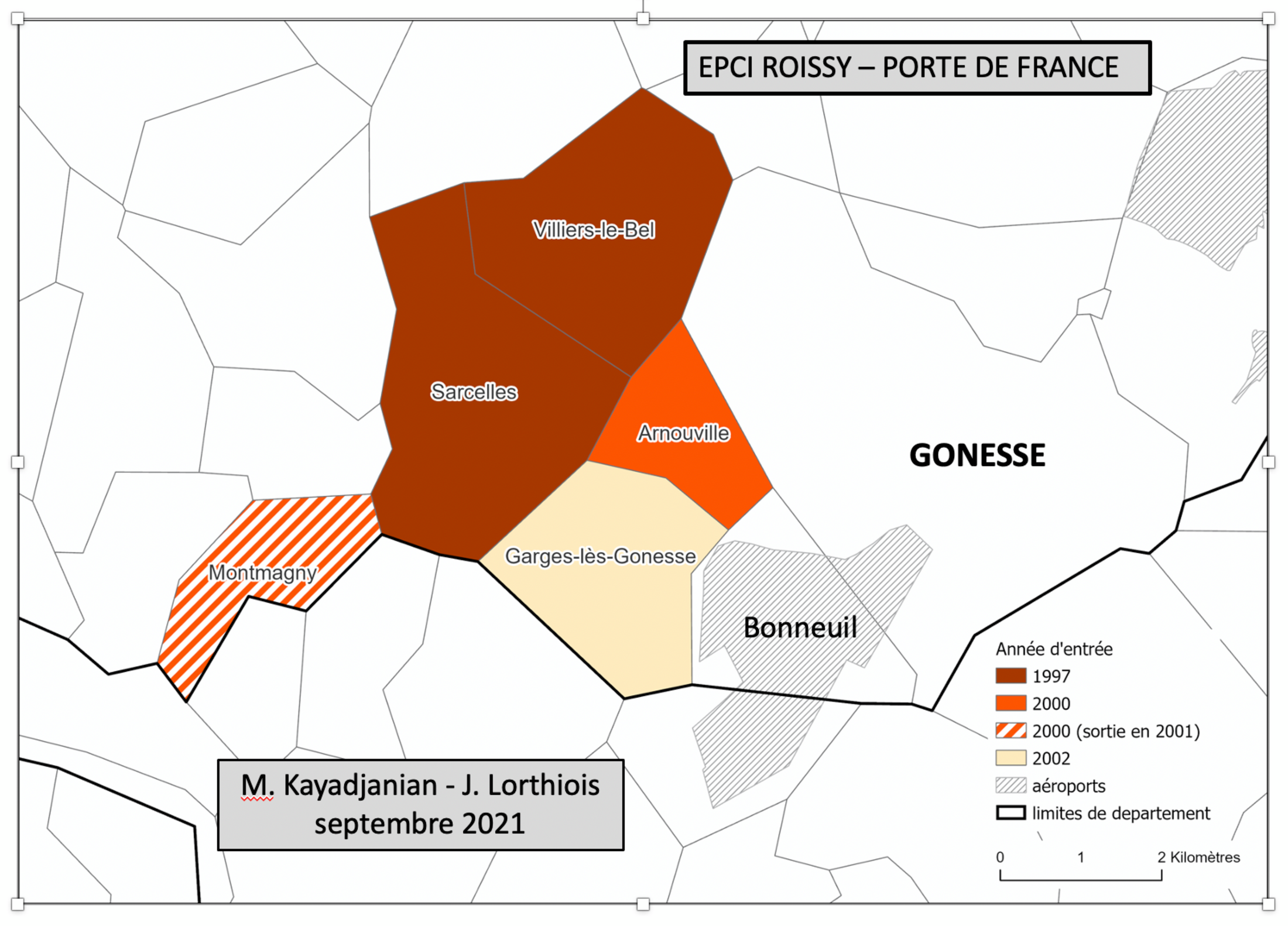 Pendant ce temps, au sud du secteur Est-95, s’est organisée de son côté, en zone urbaine dense, une communauté de communes intitulée « Val de France » sur des bases totalement différentes, avec quelques villes fortement peuplées de classes populaires, positionnées à gauche. Au départ, en 1997, deux municipalités socialistes se fédèrent : Sarcelles, (près de 60 000 habitants en 1999) et Villiers-le-Bel (26 000). Elles se caractérisent par un tissu urbain de grands ensembles et de quartiers sensibles, très déficitaire en emplois (pour les deux communes : 19 115 postes de travail en 1999, contre 36 377 actifs « totaux », soit un ratio couvert à 52%) avec des taux de chômage et de pauvreté élevés (revenu médian annuel [17] en 2011 : Sarcelles, 12 036 € ; Villiers-le-Bel, 11 880 €, contre 23 100 € en moyenne pour l’EPCI de Roissy-Porte de France). Ce tandem est rejoint en 2000 par la ville de Montmagny, pour une durée-éclair : dès 2001, le maire PS est remplacé par un élu RPR qui effectue alors un repli stratégique vers la communauté d’agglomération de droite de la Vallée de Montmorency (CAVAM). Deux communes de droite se rajoutent à cet ensemble : Arnouville en 1999 (même tissu urbain, même gare que Villiers-le-Bel) ; puis Garges-lès-Gonesse en 2002, ce qui permet à l’intercommunalité d’accéder au statut de communauté d’agglomération. Il est à noter qu’une « entente cordiale » s’est instaurée entre le PS de Sarcelles et la droite de Garges-lès-Gonesse pour empêcher le PC de reprendre son fief historique gargeois occupé durant 50 ans et perdu en 1995, qu'une union de la gauche aurait permis de regagner. La constitution progressive de l'EPCI est illustrée Figure 2.