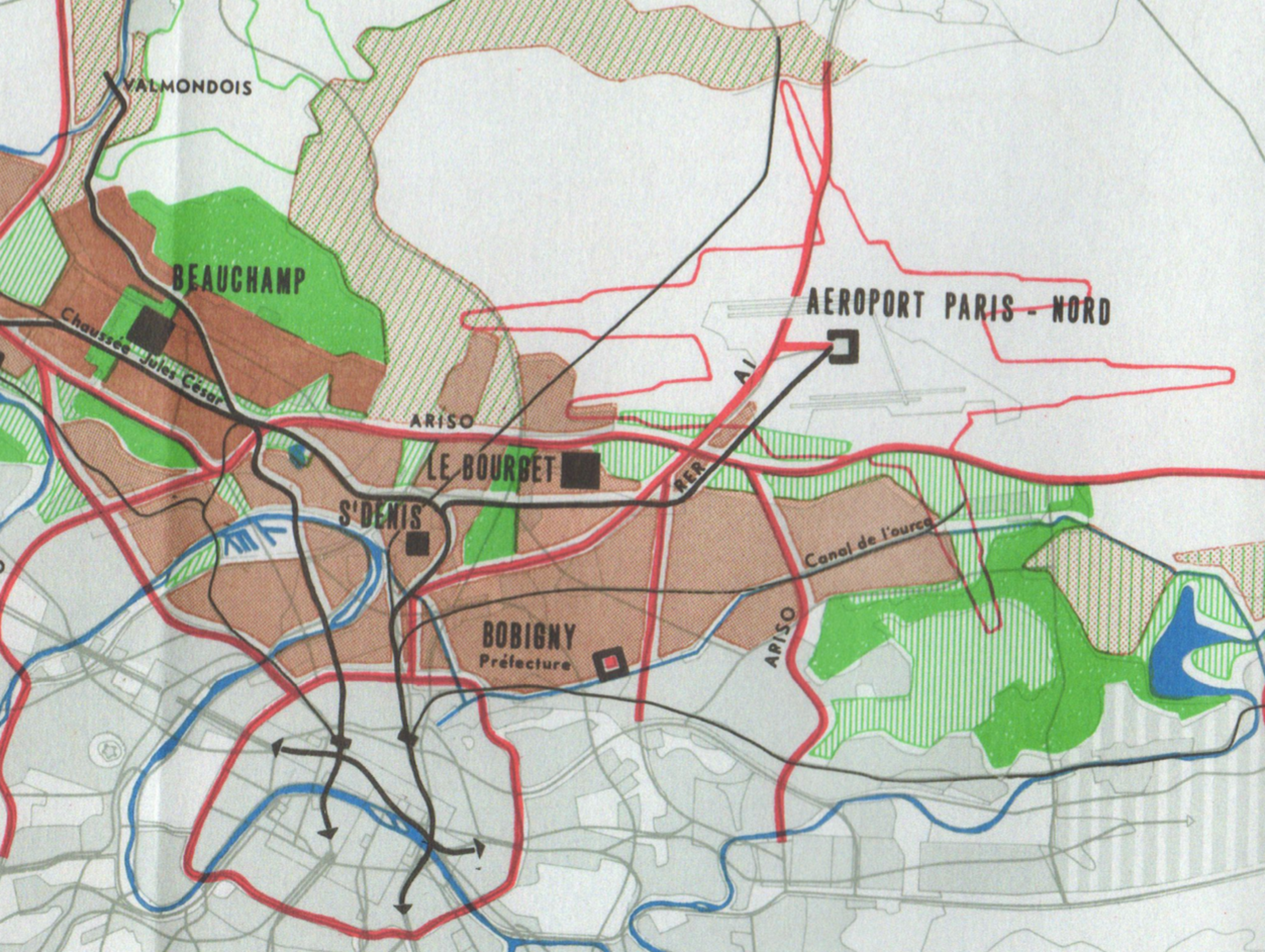 Le projet de BIP (Boulevard Intercommunal du Parisis) est une très vieille histoire. Imaginée avant-guerre, cette voie rapide initialement appelée ARISO, « Autoroute interurbaine de Seine-et-Oise », fut inscrite en 1960 au PADOG, le premier schéma d’urbanisme de ce qui allait devenir l’Ile-de-France : le « Plan directeur d’organisation générale de la région parisienne ». Cette autoroute a été reprise dans le SDAU de 1965, le « Schéma Directeur d’Aménagement et d’Urbanisme de la Région de Paris » mis en œuvre par le préfet Paul Delouvrier. Sur la carte jointe extraite de ce document (Figure 1), on voit que l’ARISO marquait la limite nord de la zone agglomérée de ce qui s’appelait à l’époque la « région de Paris », reliant deux pôles tertiaires abandonnés depuis (Beauchamp et Le Bourget) et se prolongeant jusqu’à Marne-la-Vallée. Un axe décrit comme constituant une grande tangentielle Est-Ouest, selon « une trame de voirie de même orientation que celle de la vallée, dont l’élément essentiel retrouve l’ancien tracé de la chaussée Jules César. » Cette voie gallo-romaine avait généré le tracé rectiligne de la nationale 14, devenue ensuite la départementale D 14. Il est dit dans le SDAU de 1965 que le long de cet axe urbain « s’échelonneront, autour d’espaces plantés, des équipements publics et des groupes d’habitation de forte densité ». Mais il était nullement question de réaliser un continuum urbain comme aujourd'hui.