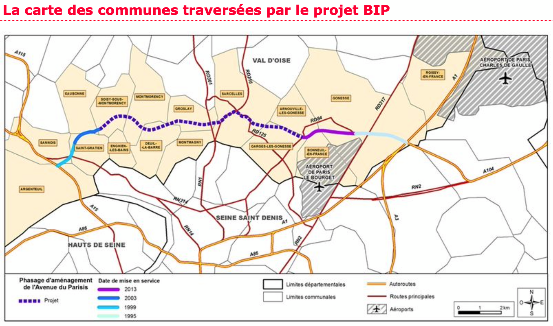 Sur la carte ci-dessous (Figure 3), nous observons un ruban de territoire traversé par le projet de voie rapide, composé de 14 communes alignées d’ouest en est - que nous appellerons en raccourci « Linéaire du BIP ». Une partie de cet axe a été réalisée à partir de 1992 (figurant sur la carte en traits pleins, par opposition aux pointillés), avec la mise en service du tronçon le plus à l’Est d’une longueur de 3,4 km, traversant le Triangle de Gonesse à partir de l’autoroute A1 (en bleu ciel) puis jusqu’à Bonneuil-en-France (en violet). A l’autre extrémité de cet axe, le tronçon Ouest partant de l’A 15 à hauteur d’Argenteuil et desservant Saint-Gratien, Sannois et Eaubonne a été inauguré en 1999, puis en 2003 jusqu’à Soisy-sous-Montmorency (en bleu turquoise). De l’autre côté de la frontière du Val d’Oise, à l’Est de l’autoroute A1 en Seine-Saint-Denis, un segment de 3,5 km de l’ancienne A 87 a été réalisé en 1980 entre Gonesse et Villepinte et a été intégré à l’A 104 permettant ainsi provisoirement le bouclage de la Francilienne en Plaine de France, alors que le vrai tracé passait au nord de l’aéroport de Roissy. Ce tronçon d'autoroute depuis longtemps programmé est enfin actuellement en travaux.