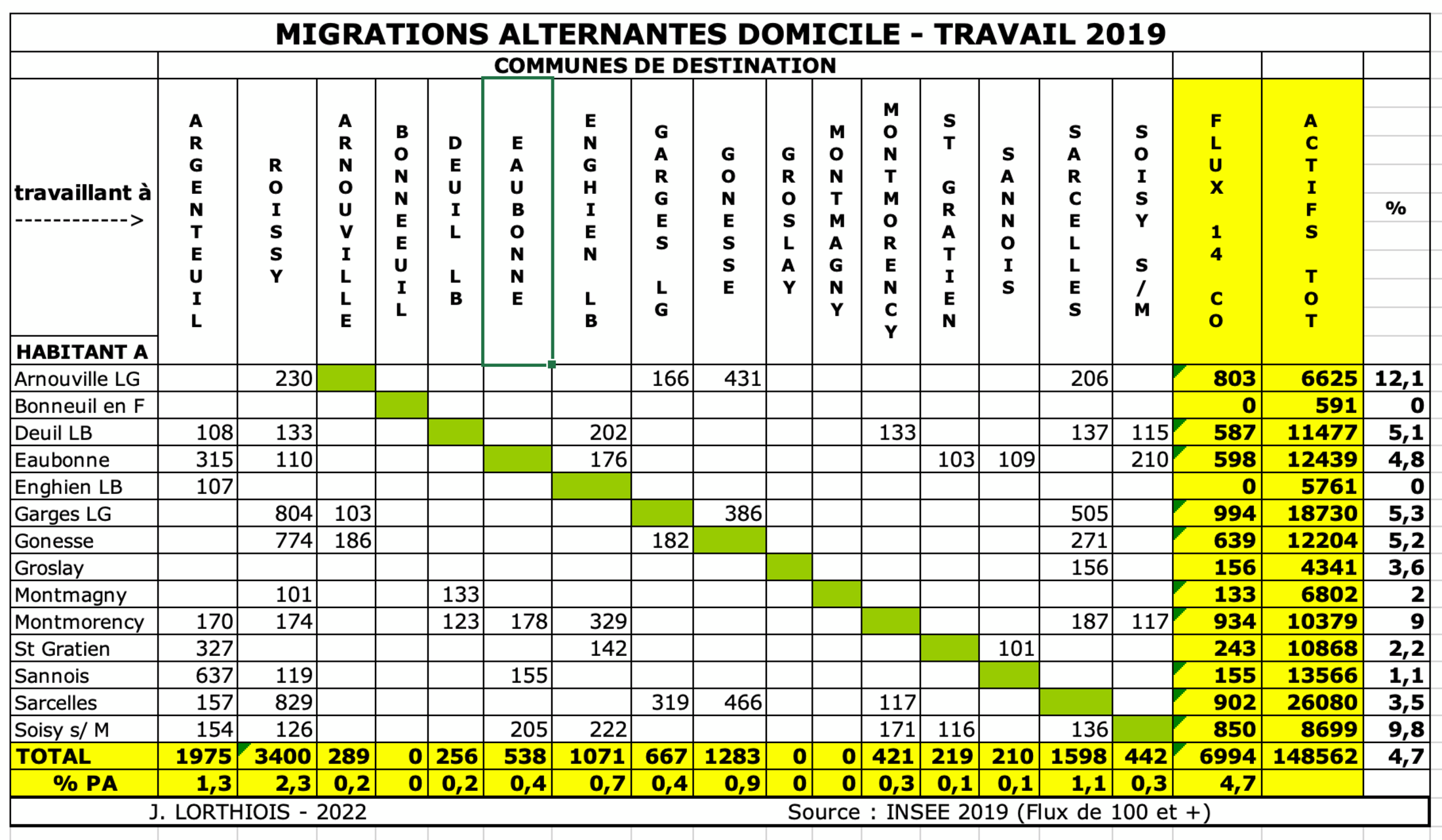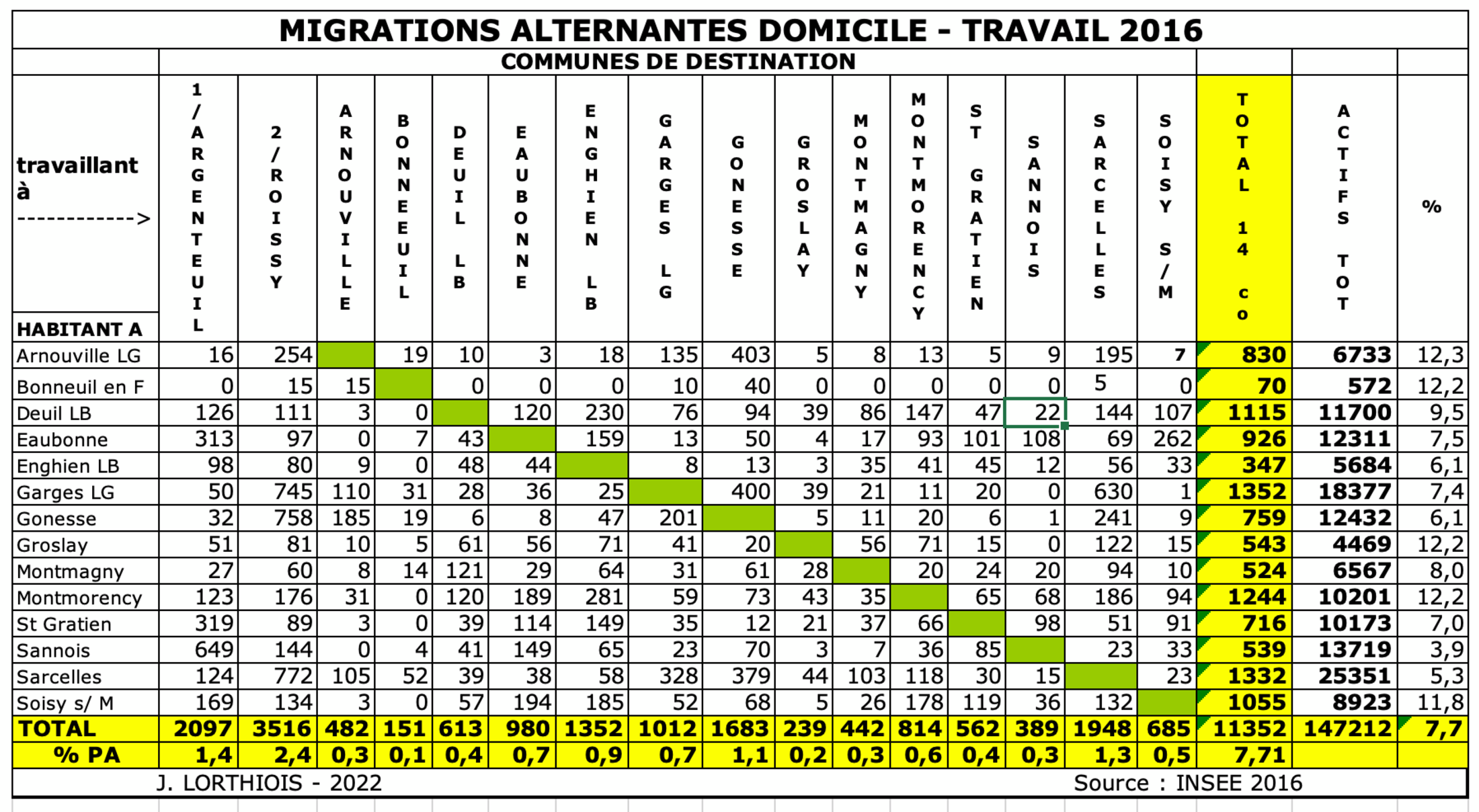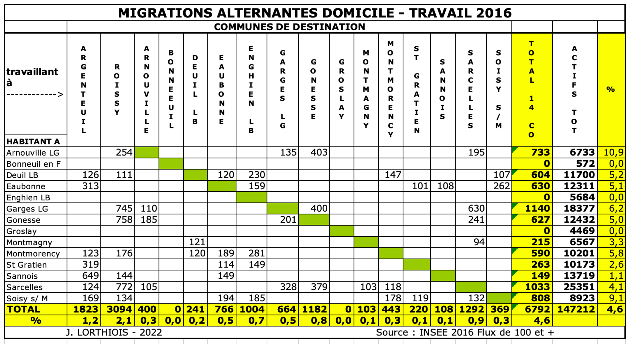 Dans le tableau ci-après (Figure 5), nous avons listé les 14 villes du Linéaire (par ordre alphabétique en lignes, à gauche du tableau) et indiqué les lieux de destination des actifs migrants (par ordre alphabétique, en colonnes). Nous avons calculé d'une part l’attractivité des deux pôles d’emplois situés aux extrémités de l’axe - Roissy et Argenteuil – ; d'autre part les échanges internes d’actifs des 14 localités entre elles. La population active (colonne de droite) concerne les « actifs totaux » (chômeurs compris), parce que la mesure de l'utilité d'un transport doit intégrer les actifs en recherche d'emploi, puisqu'on prétend à chaque fois que c'est prioritairement "pour eux" qu'on prévoit cette offre nouvelle. Précaution importante, qui n'est généralement pas respectée par le Conseil Départemental du Val d'Oise, par exemple lors du débat public de 2016 consacré au projet Europacity.