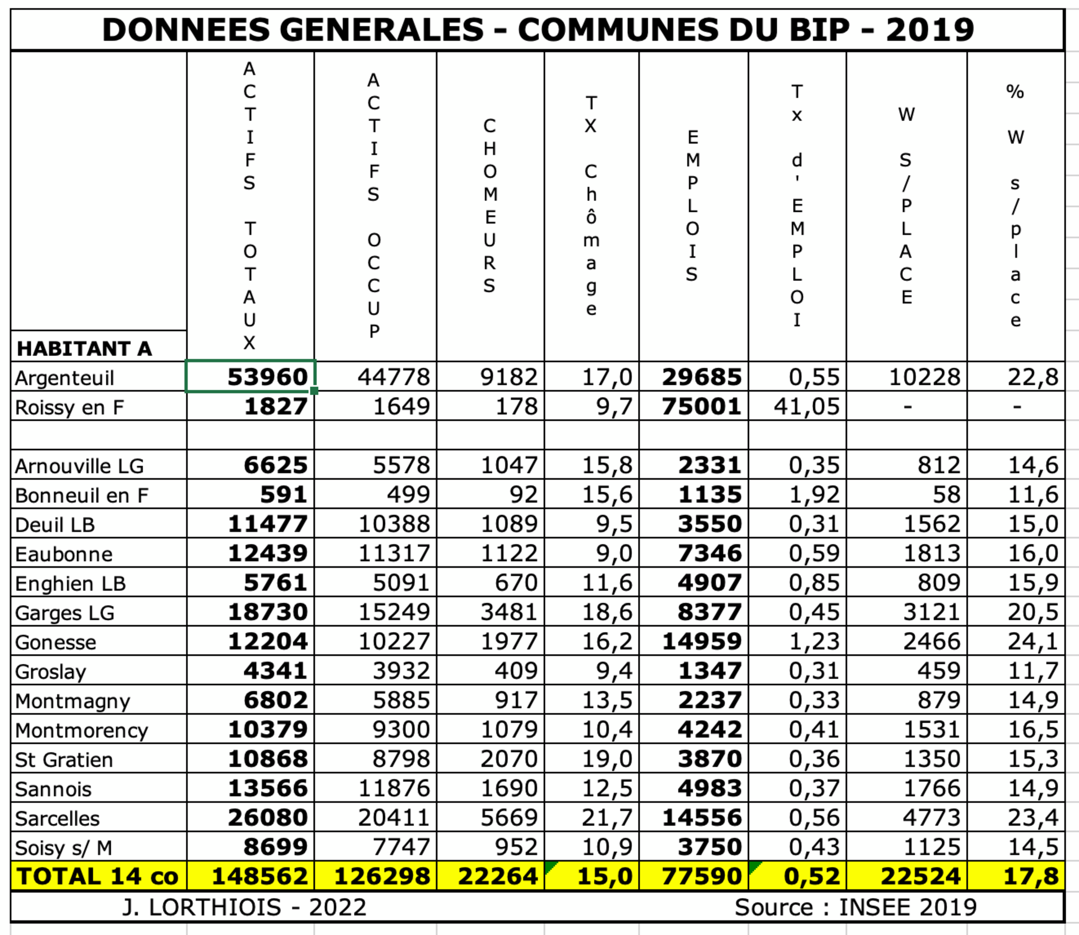 Nous avons souhaité mesurer l’utilité réelle du projet de BIP pour les populations locales des communes traversées. Pour ce faire, nous avons la chance de bénéficier des dernières données statistiques parues cet été : le recensement INSEE de 2019. Dans le tableau ci-dessous (Figure 4) nous avons listé les 14 communes de ce que nous avons appelé le « Linéaire du BIP ». Nous avons également indiqué à titre de comparaison Argenteuil et Roissy, deux pôles d'emplois situés de part et d'autre de l'axe routier, mais qui n'appartiennent pas au territoire et dont les données ne sont pas comptabilisées dans le total.