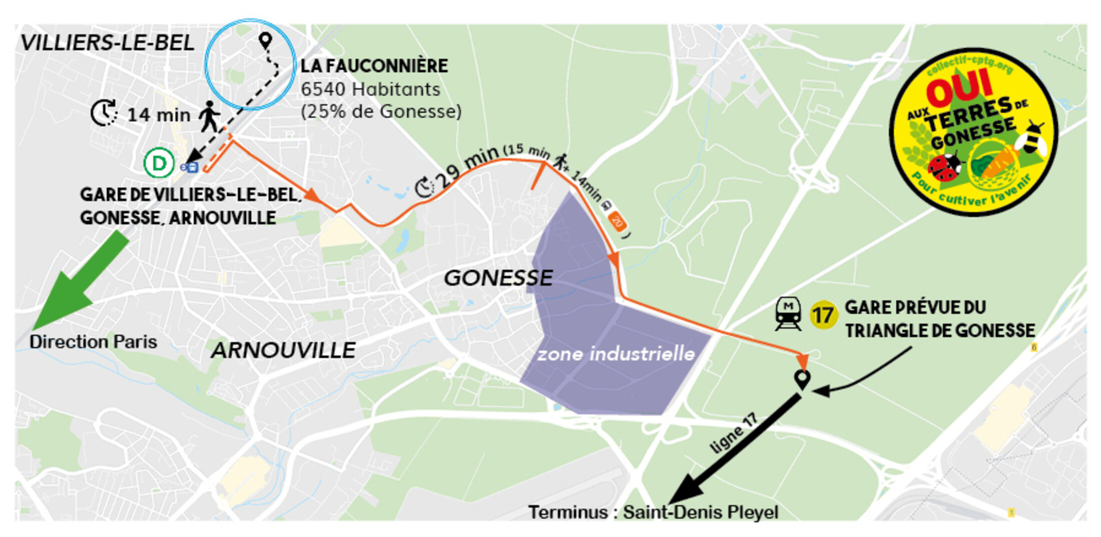 Autre exemple, toujours à Gonesse et pour un habitant de La Fauconnière, le calcul d’un trajet de Gonesse jusqu’à la gare du Nord. En allant sur le site de la SGP, j’ai la surprise de constater ces données : sans GPE, 53 minutes ; avec GPE, 24 minutes. Les trajets respectifs sont les suivants : - sans GPE, prendre un bus indiqué 22 (en réalité c’est le 23) pour aller du Triangle au centre-ville de Gonesse pour rejoindre la gare du RER D (!) On croit rêver : le logiciel n’intègre pas que nous sommes en plein champ, sans aucun habitant, donc sans usager des transports… Et qu’il n’y a besoin d’aucun moyen de transport pour rejoindre la gare du RER D depuis La Fauconnière. Il suffit de 10 mn à pied et 20 mn jusqu’à la gare du Nord, c’est direct. Total : 30 mn.