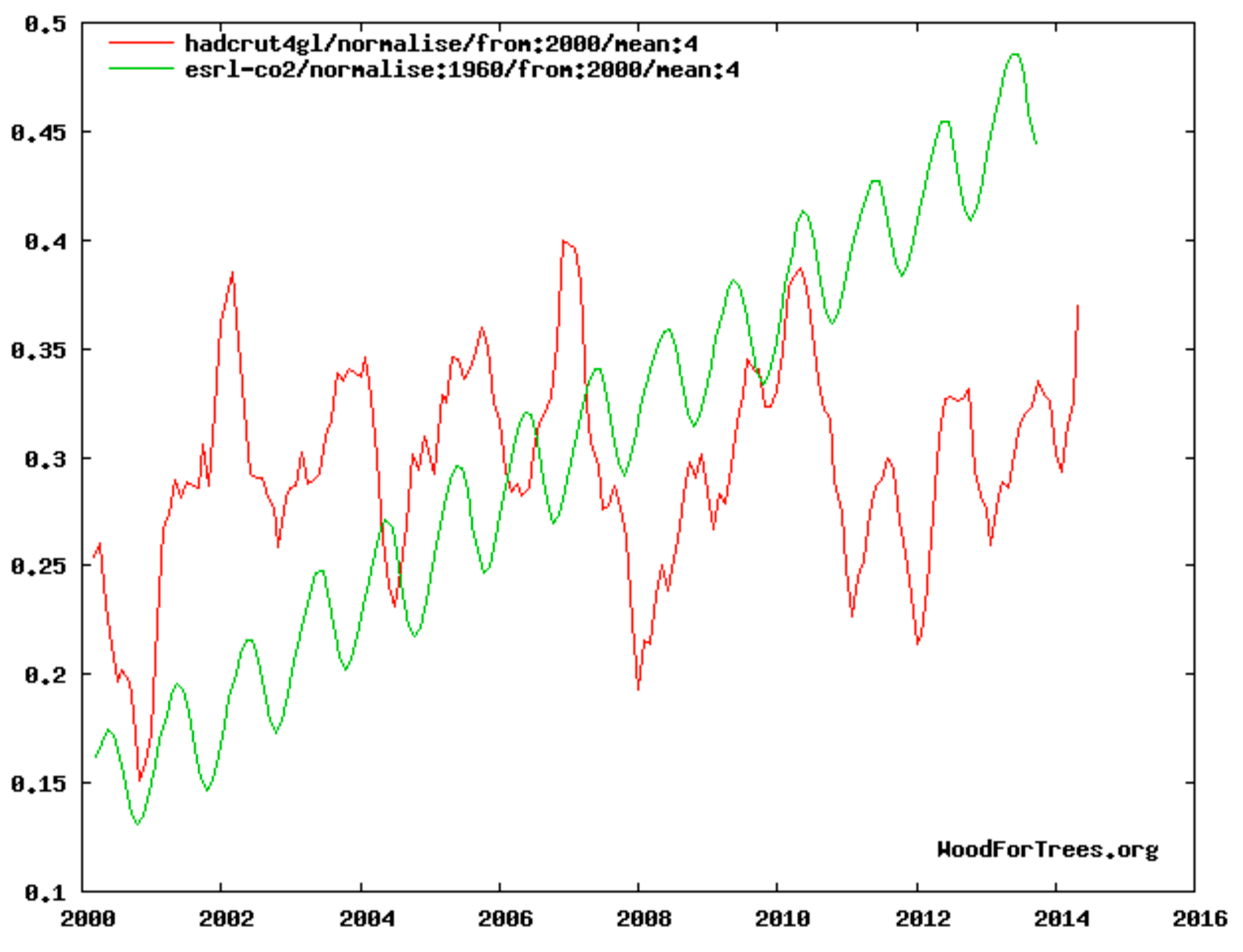 Voici comme illustration les courbes des 14 dernières années de la température dite "globale" (en rouge) et de celle du CO2 présent dans l'atmosphère (en vert). Provenant du site woodfortrees. org. Question, l'une est-elle la cause de l'autre ? Hum…